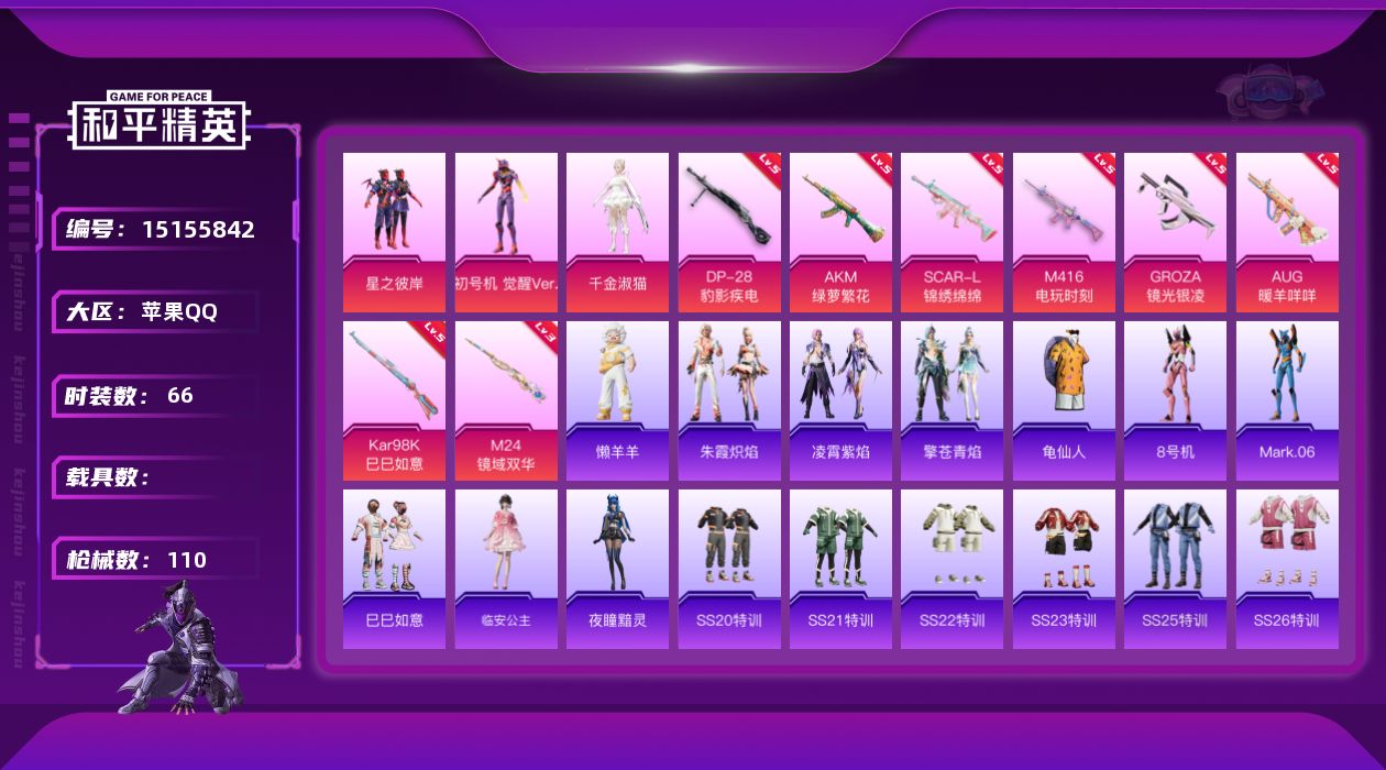 [15155842]可二次【店主推荐捡漏号!可直接换绑】 苹果 手Q-3粉装-8特效枪-3粉色飞行器-3.5w热力值-9王牌印记-66套装-110枪皮【热门品类】:套装-龟仙人,角色-8号机,角色-Mark.06【粉色套装】:粉装-星之彼岸,角色-初号机 觉醒Ver.,角色-千金淑猫【粉色枪皮等级】:AKM-绿萝繁花(五级),SCAR-L-锦绣绵绵(五级),M416-电玩时刻(五级),GROZA-镜光银凌(五级),AUG-暖羊咩咩(五级),Kar98K-巳巳如意(五级),M24-镜域双华(三级),DP-28-豹影疾电(五级)【粉色飞行器】:星之彼岸飞行器,镜域双华-灵镜之阶,初号机 觉醒Ver.飞行器