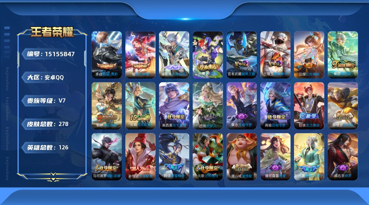 [15155847]【店主推荐捡漏号!可直接换绑/2498星币可兑换星元皮肤】:安卓Q-V7-最强王者段位-126英雄-278皮肤-2典藏皮肤-1无双-1珍品传说-1星元-3传说-71史诗