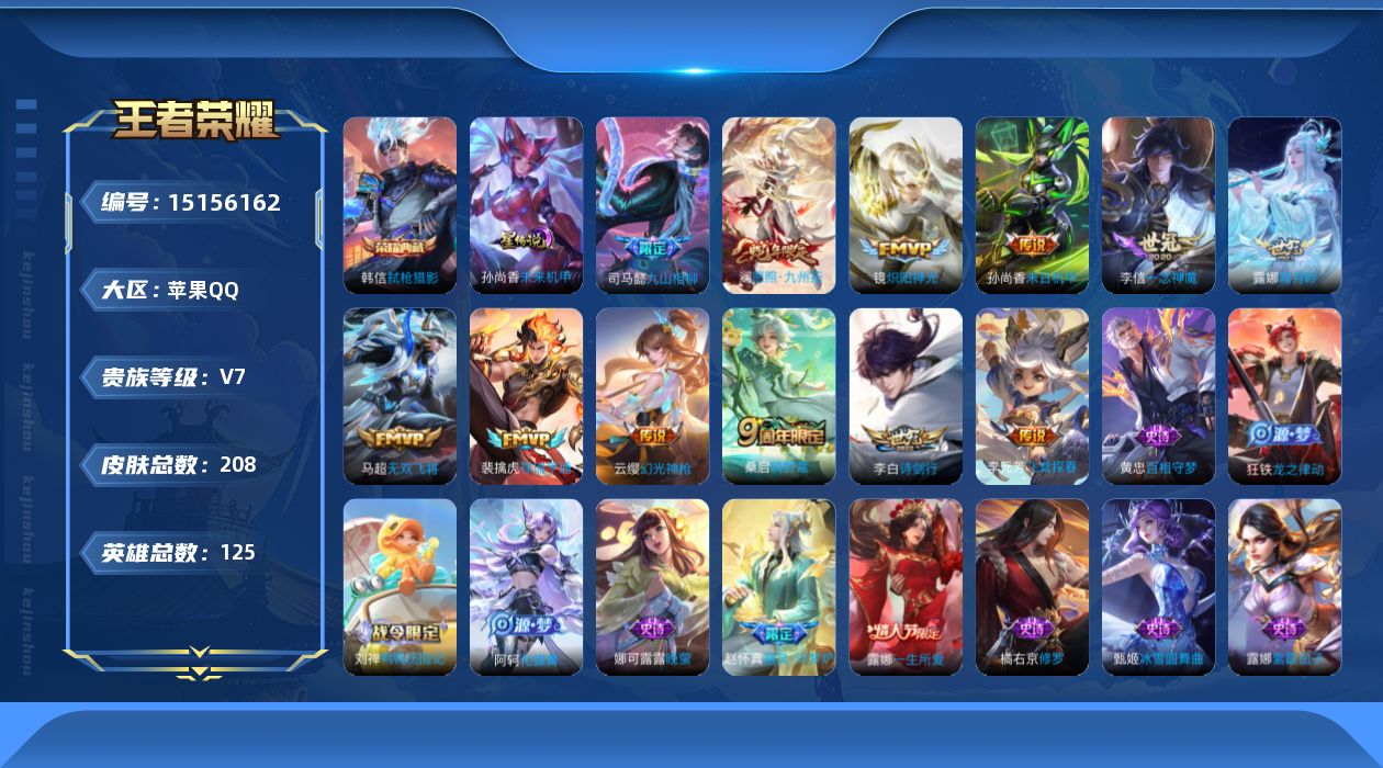 [15156162]可二次【店主推荐捡漏号!可直接换绑】苹果Q-V7-至尊星耀III段位-125英雄-208皮肤-1典藏皮肤-12传说-52史诗