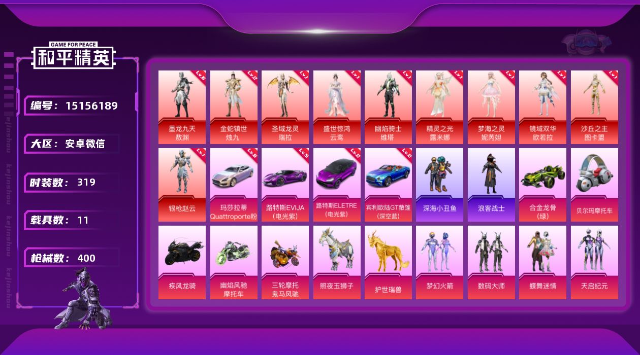 [15156189]安卓 微信-10神装-43粉装-26特效枪-11载具-21粉色飞行器-202291热力值-23王牌印记-319套装-400枪皮