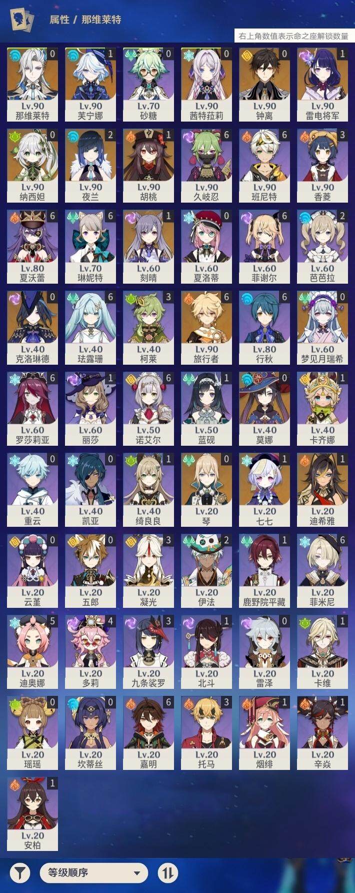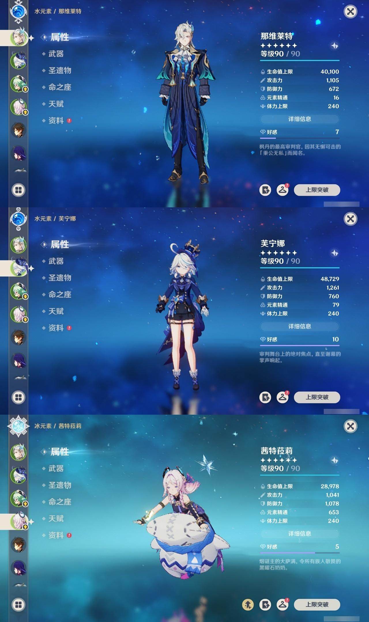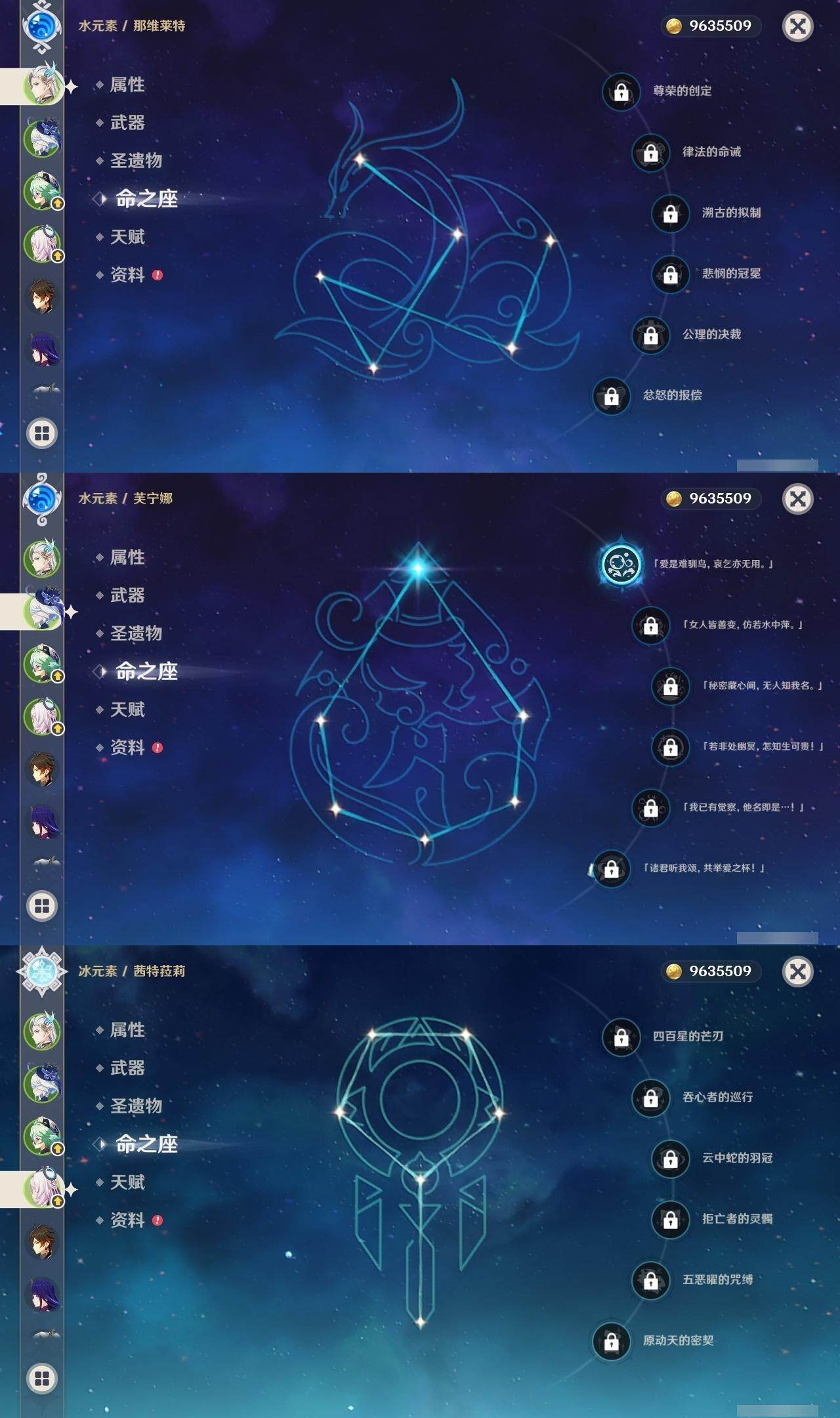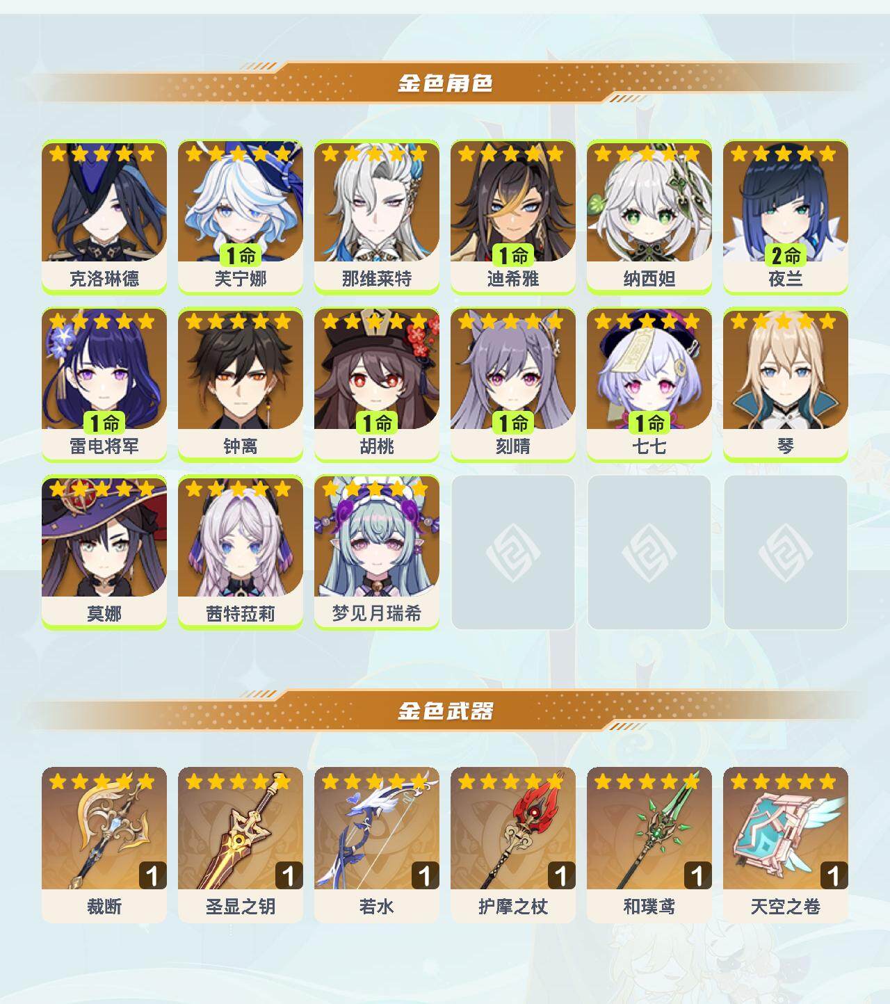 0命克洛琳德,1命芙宁娜,0命那维莱特,1命迪希雅,0命纳西妲,2命夜兰,1命雷电将军,0命钟离,1命胡桃,1命刻晴,1命七七,0命琴,0命莫娜,0命茜特菈莉,0命梦见月瑞希,精1裁断,精1圣显之钥,精1若水,精1护摩之杖,精1和璞鸢,精1天空之卷