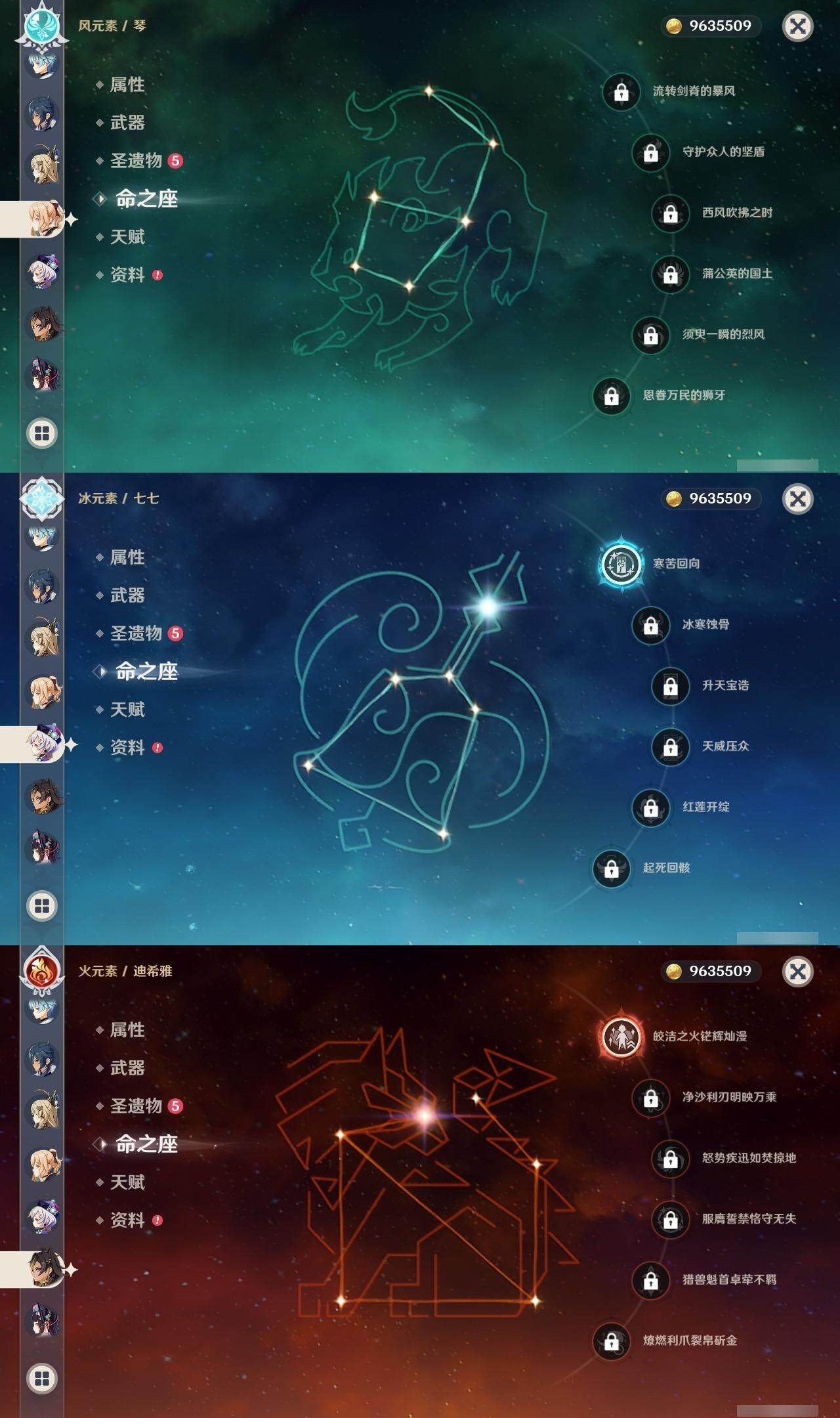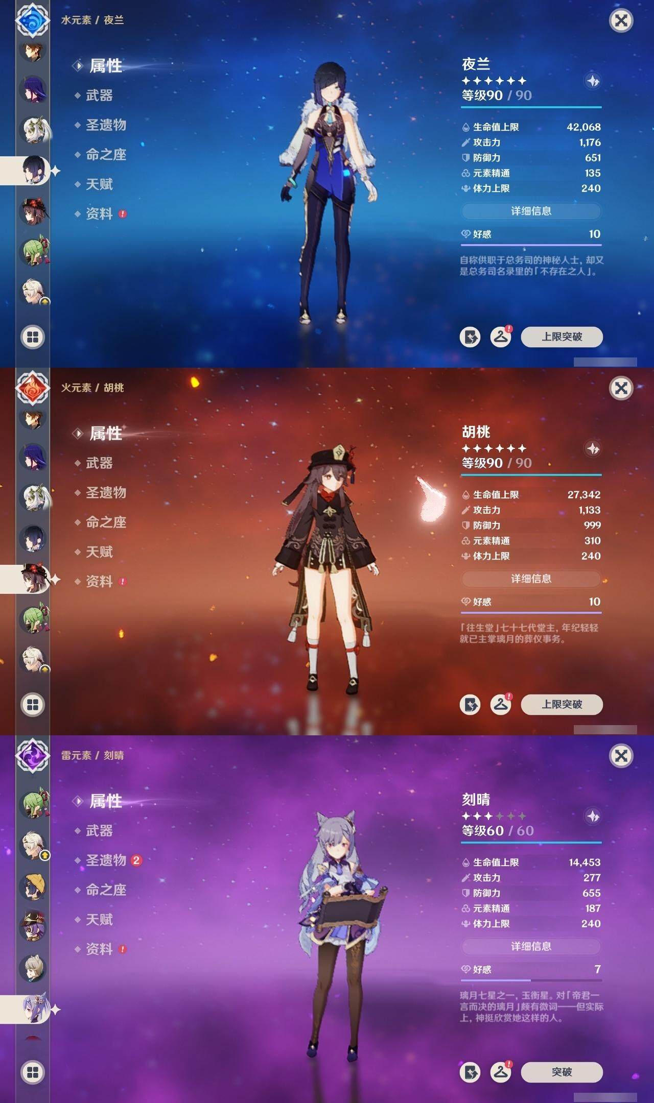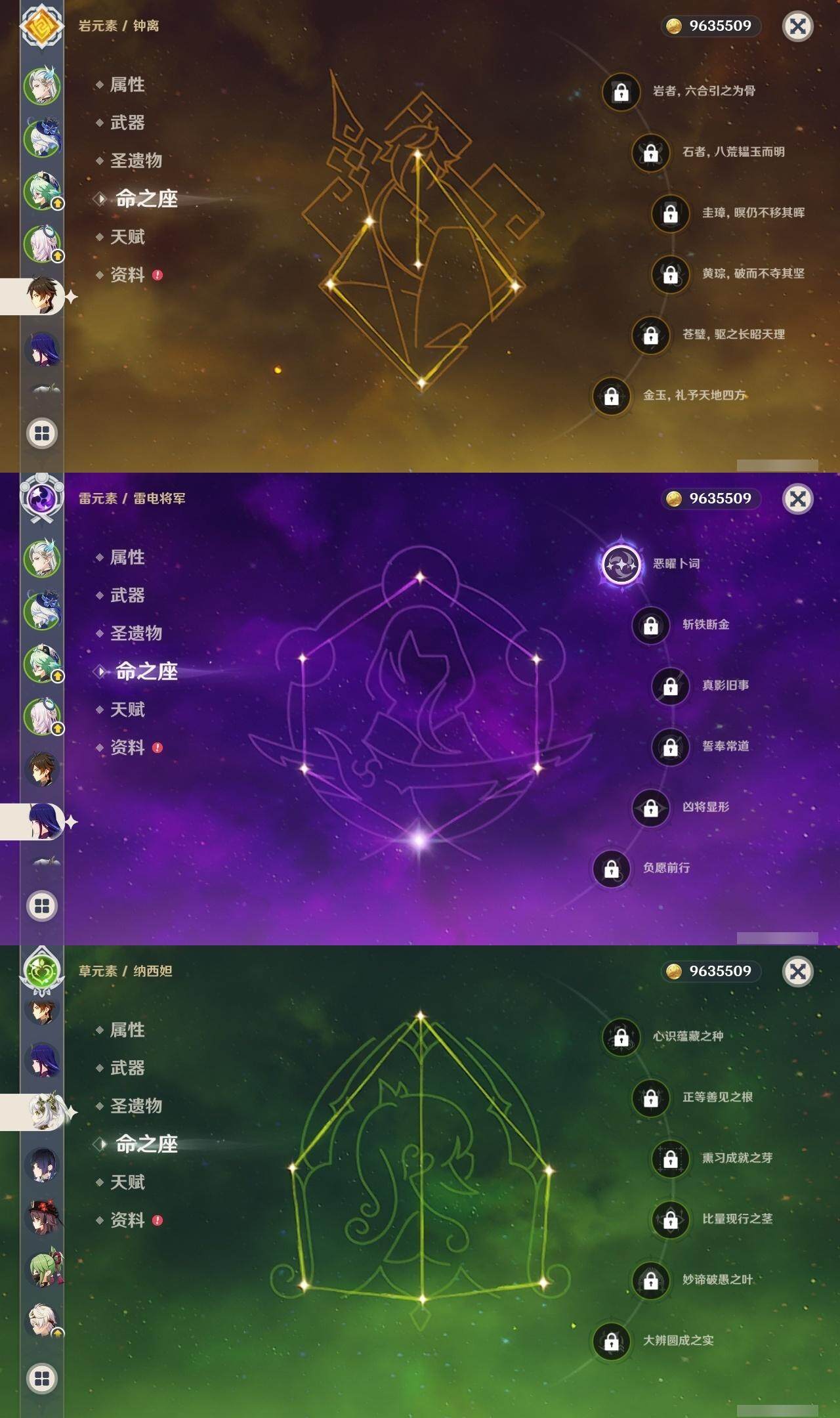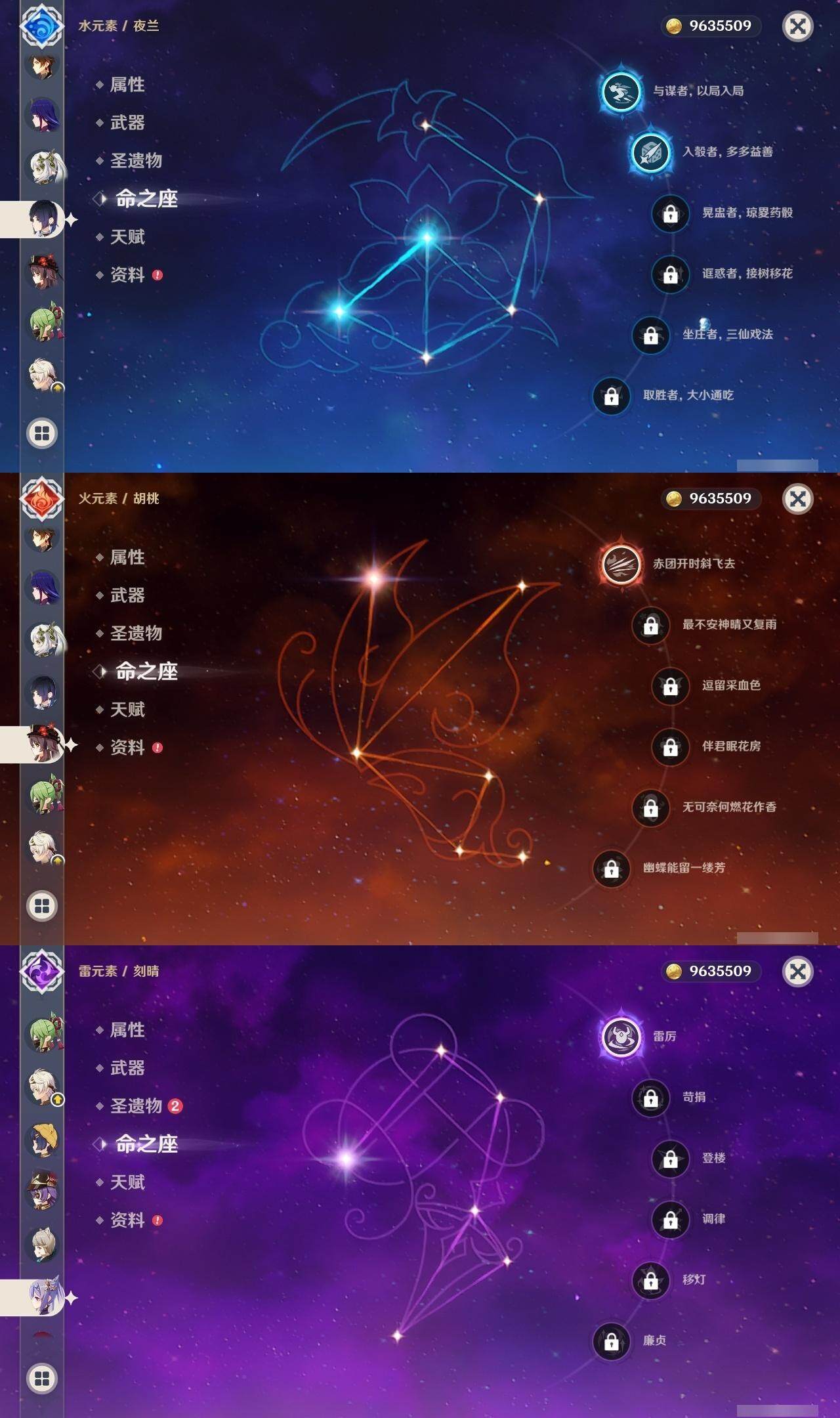 0命克洛琳德,1命芙宁娜,0命那维莱特,1命迪希雅,0命纳西妲,2命夜兰,1命雷电将军,0命钟离,1命胡桃,1命刻晴,1命七七,0命琴,0命莫娜,0命茜特菈莉,0命梦见月瑞希,精1裁断,精1圣显之钥,精1若水,精1护摩之杖,精1和璞鸢,精1天空之卷