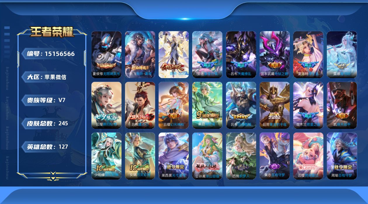 [15156566]苹果WX-V7-最强王者段位-127英雄-245皮肤-1典藏皮肤-1珍品传说-16传说-81史诗