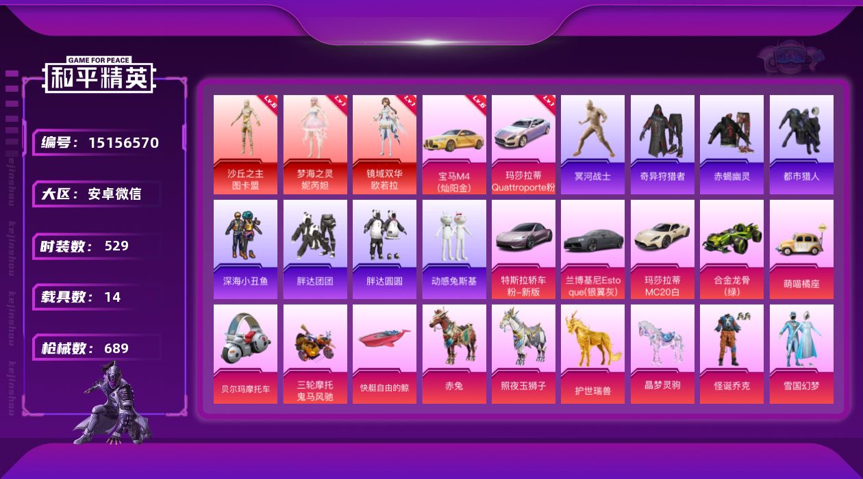 [15156570]安卓 微信-女号裙子素材号!无敌战神框-3神装-100粉装-54特效枪-14载具-31粉色飞行器-331403热力值-19王牌印记-529套装-689枪皮