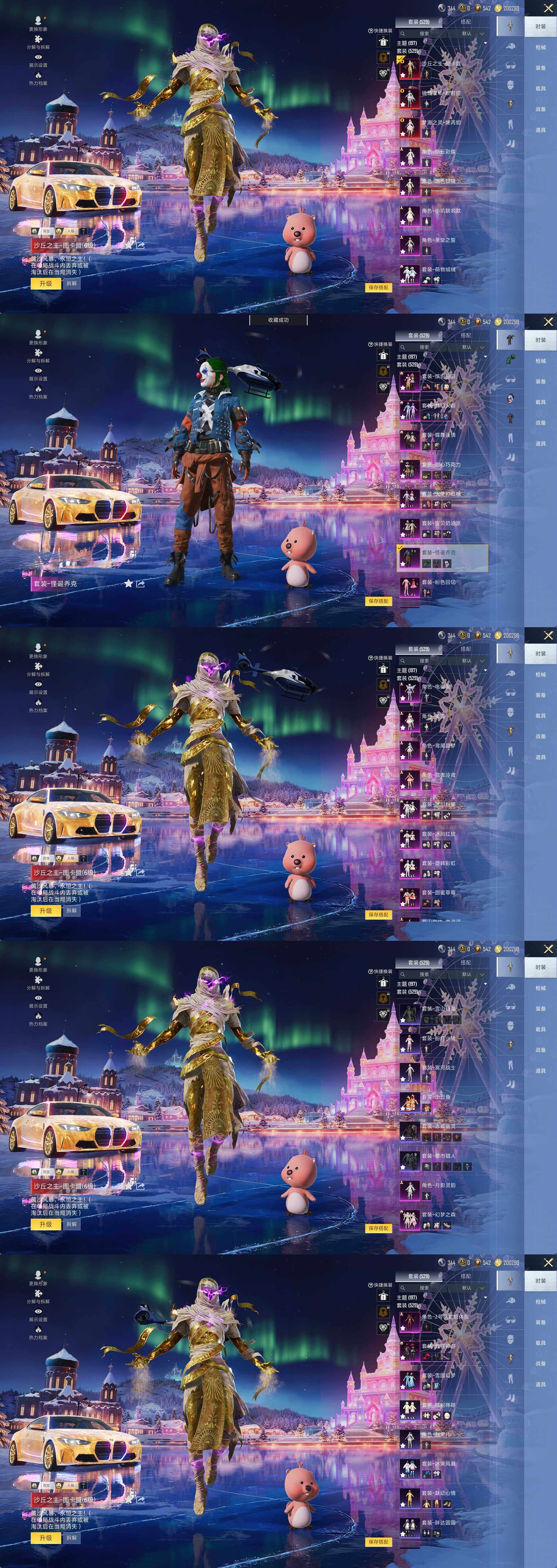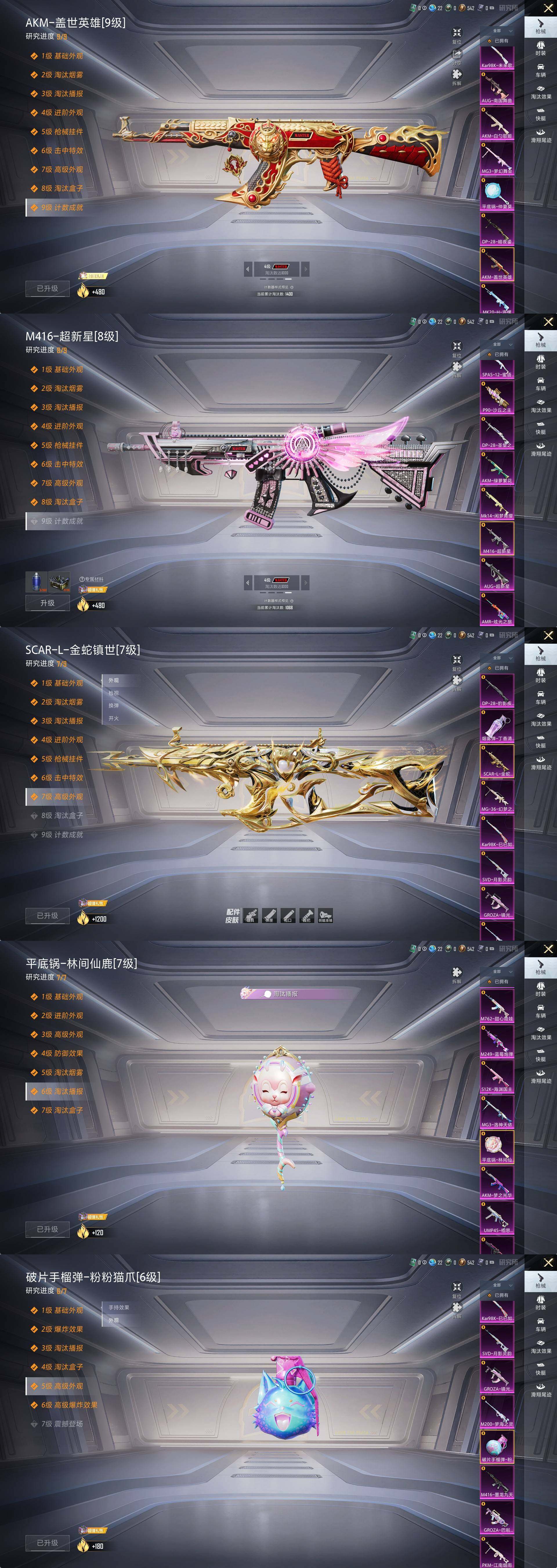 AKM-梦之光华,AKM-盖世英雄,AKM-白勺歌姬,AKM-绿萝繁花,M16A4-垂柳戏鸭,SCAR-L-童趣迷兔,SCAR-L-甜梦小狐,SCAR-L-金蛇镇世,M416-心之恋语,M416-暖熊萌萌,M416-超新星,M416-墨龙九天,GROZA-香水柠檬,GROZA-旋转彩虹,GROZA-巴啦啦小魔仙,GROZA-镜光银凌,AUG-星之彼岸,AUG-妙趣可丽,AUG-南国舞曲,AUG-超新星,M762-甜蜜誓约,M762-甜心娃娃,UZI-绮梦青鸾,UMP45-相思残雪,Vector-环太平洋,Vector-灵感创作师,汤姆逊-冰川粉黛,P90-甜蜜草莓,P90-粉樱探戈,P90-沙丘之主,Kar98K-未来歌姬,Kar98K-巳巳如意,M24-镜域双华,AWM-橘柚倾心,Mk14-闲梦青缨,AMR-炫光之旅,MK20-H-海螺星光,M200-梦海之灵,SVD-月影灵韵,S12K-海渊国主,SPAS-12-蜜语绒猫,M249-蓝莓炮弹,M249-彩虹甜喵,DP-28-暗夜鎏金,DP-28-圣堂之誓,MG3-洛神天依,MG3-梦幻舞会,PKM-江南烟雨,MG-36-幻梦之森,平底锅-林间仙鹿,平底锅-仲夏莫吉托,烟雾弹-丁香清露,破片手榴弹-粉粉猫爪