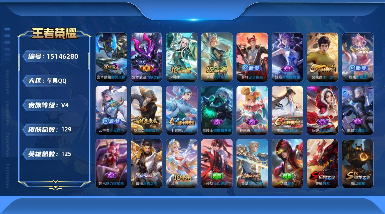 [15146280]可二次【店主推荐捡漏号!可直接换绑】苹果Q-V4-永恒钻石V段位-125英雄-129皮肤-2传说-1星传说-15史诗 【英雄全皮】:孙权全皮 【传说皮肤】:后羿神树通天,宫本武藏地狱之眼 【限定皮肤】:姜子牙天穹之誓,狄仁杰阴阳师,嬴政优雅恋人,庄周高山流水,芈月重明,夏侯惇朔风刀,曹操烛龙,典韦穷奇,狄仁杰万华元夜,达摩沙漠行僧,项羽海滩派对,老夫子醍醐杖,程咬金演武夺筹,兰陵王金庭之子,牛魔御旌,李元芳云中旅人,钟馗驱傩正仪,鬼谷子原初探秘者,苏烈千军破阵,弈星混沌棋,沈梦溪大漠名商,明世隐疑决卦,裴擒虎李小龙,裴擒虎擒涛扼浪,米莱狄御霄,云中君纤云弄巧,盾山御銮,上官婉儿梁祝,嫦娥拒霜思,鲁班大师探海日志,桑启海盐诗旅,张良古海寻踪,鬼谷子天穹祈灯,刘邦剑破天穹 【赛季限定】:芈月重明,夏侯惇朔风刀,曹操烛龙,典韦穷奇,狄仁杰万华元夜,达摩沙漠行僧,老夫子醍醐杖,程咬金演武夺筹,兰陵王金庭之子,张良古海寻踪,牛魔御旌,李元芳云中旅人,钟馗驱傩正仪,鬼谷子原初探秘者,苏烈千军破阵,弈星混沌棋,沈梦溪大漠名商,明世隐疑决卦,裴擒虎擒涛扼浪,米莱狄御霄,盾山御銮,鲁班大师探海日志,桑启海盐诗旅,鬼谷子天穹祈灯,刘邦剑破天穹,姜子牙天穹之誓 【史诗皮肤】:貂蝉圣诞恋歌,甄姬冰雪圆舞曲,孙尚香水果甜心,嬴政优雅恋人,妲己魅力维加斯,兰陵王暗隐猎兽者,狄仁杰鹰眼统帅,上官婉儿梁祝,裴擒虎李小龙,云中君纤云弄巧,庄周高山流水,嫦娥拒霜思,狂铁龙之律动,女娲万灵启世,少司缘巫礼祀神 【其他皮肤】:项羽海滩派对,韩信教廷特使,露娜哥特玫瑰,阿轲爱心护理,达摩大发明家,赵云忍炎影,白起白色死神,扁鹊化身博士,安琪拉玩偶对对碰,妲己少女阿狸,亚瑟死亡骑士,达摩拳王,花木兰兔女郎,张飞五福同心,甄姬花好人间,刘备万事如意,宫本武藏万象初新,后羿阿尔法小队,狄仁杰阴阳师,刘备纽约教父,刘备汉昭烈帝,关羽龙腾万里,钟无艳海滩丽影,曹操烛龙,芈月重明,老夫子功夫老勺,孙尚香沉稳之力,典韦穷奇,诸葛亮掌控之力,李白敏锐之力,鬼谷子幻乐之宴,大乔守护之力,米莱狄御霄,明世隐虹云星官,牛魔御旌,吕布野性能量,盾山御銮,姜子牙炽热元素使,夏侯惇朔风刀,弈星混沌棋,鲁班七号黑桃队长,明世隐疑决卦,老夫子醍醐杖,狂铁特工战影,鬼谷子原初探秘者,狄仁杰万华元夜,刘禅秘密基地,程咬金演武夺筹,张良缤纷绘