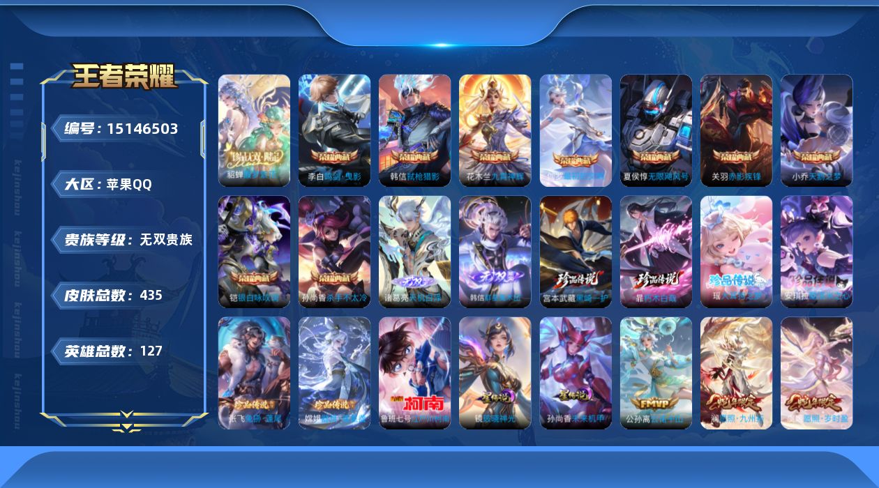 [15146503]【店主推荐捡漏号!可直接换绑】苹果Q-V11-永恒钻石I段位-127英雄-435皮肤-9典藏皮肤-1珍品无双-2无双-7珍品传说-42传说-134史诗 【英雄全皮】:孙权全皮,苍全皮,李信全皮,蒙恬全皮,澜全皮,司空震全皮,戈娅全皮,空空儿全皮,影全皮 【荣耀典藏】:夏侯惇无限飓风号,小乔天鹅之梦,孙尚香杀手不太冷,李白鸣剑曳影,花木兰九霄神辉,关羽赤影疾锋,铠银白咏叹调,韩信弑枪猎影,伽罗最初的交响 【珍品无双】:貂蝉馥梦繁花 【无双皮肤】:韩信群星魔术团,诸葛亮天机白泽 【珍品传说】:鲁班七号江户川柯南,嫦娥器灵落星盏,张飞兔狲蓬尾,瑶大耳狗之梦,安琪拉酷洛米之心,暃朽木白哉,宫本武藏黑崎一护 【传说皮肤】:后羿神树通天,公孙离云诺千山,杨玉环星之鸣奏,司空震愿照山河定,女娲愿照千秋盛,妲己愿照众生和,澜愿照九州拓,虞姬愿照岁时盈,云缨幻光神枪,裴擒虎祥瑞亨通,桑启鸣野蒿,亚连落雪白狼,澜逐花归海,艾琳觅芳踪,露娜霜月吟,甄姬至美化雀舞,马可波罗妄想实况,诸葛亮鹤羽星尊,澜电玩雷克斯,公孙离记忆之芯,夏洛特浮生妄,花木兰燃星之曲,小乔山海琳琅生,曜山海苍雷引,李信山海炽霜斩,百里守约碎云,孙策末日机甲,鲁班七号寅虎瑞焰,王昭君乞巧织情,周瑜音你心动,小乔音你心动,公孙离祈雪灵祝,诸葛亮时雨天司,铠绛天战甲,镜炽阳神光,虞姬启明星使,曜云鹰飞将,李信一念神魔,刘备时之恋人,干将莫邪久胜战神,孙尚香末日机甲,宫本武藏地狱之眼 【限定皮肤】:姜子牙天穹之誓,狄仁杰阴阳师,小乔山海琳琅生,赵云皇家上将,赵云百木心枪,墨子降魔,妲己时之彼端,妲己时之奇旅,孙尚香蔷薇恋人,鲁班七号寅虎瑞焰,庄周高山流水,高渐离玩趣恶龙,阿轲迷踪丽影,钟无艳超时空战士,扁鹊奇幻香踪,芈月白晶晶,芈月幻夜卜梦,吕布御风骁将,元歌云间偶戏,夏侯惇朔风刀,甄姬幽恒,甄姬落雪兰心,甄姬至美化雀舞,典韦蓝屏警告,马可波罗暗影游猎,马可波罗山海玄木吟,马可波罗妄想实况,狄仁杰魔术师,狄仁杰万华元夜,达摩沙漠行僧,项羽海滩派对,老夫子醍醐杖,关羽百相守梦,程咬金演武夺筹,刘邦夺宝奇兵,兰陵王金庭之子,花木兰默契交锋,花木兰燃星之曲,亚瑟潮玩骑士王,孙悟空至尊宝,牛魔奔雷神使,后羿圣弓游侠,李元芳匿光侦查者,李元芳云中旅人,虞姬启明星使,钟馗驱傩正仪,杨玉环遇见飞天,杨玉环寅虎心曲,杨戬潮玩骑兵,干将莫邪