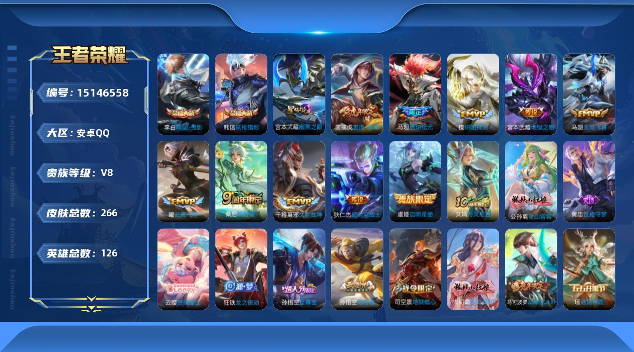 [15146558]【店主推荐捡漏号!可直接换绑】安卓Q-V8-最强王者段位-126英雄-266皮肤-2典藏皮肤-10传说-75史诗 【荣耀典藏】:李白鸣剑曳影,韩信弑枪猎影 【传说皮肤】:桑启鸣野蒿,马超琥珀纪元,马超无双飞将,裴擒虎寅虎赤拳,镜炽阳神光,虞姬启明星使,曜云鹰飞将,干将莫邪久胜战神,宫本武藏地狱之眼,狄仁杰超时空战士 【限定皮肤】:姜子牙天穹之誓,狄仁杰阴阳师,赵云皇家上将,孙尚香蔷薇恋人,高渐离玩趣恶龙,钟无艳超时空战士,扁鹊奇幻香踪,吕布御风骁将,元歌无心,夏侯惇匿光决锋者,甄姬落雪兰心,马可波罗山海玄木吟,狄仁杰魔术师,达摩沙漠行僧,项羽海滩派对,韩信飞衡,兰陵王金庭之子,孙悟空至尊宝,孙悟空孙行者,李元芳云中旅人,虞姬启明星使,钟馗神迹守卫,杨戬潮玩骑兵,鬼谷子五谷丰年,沈梦溪大漠名商,沈梦溪匿光破解者,裴擒虎寅虎赤拳,裴擒虎擒涛扼浪,上官婉儿梁祝,嫦娥拒霜思,嫦娥暖冬兔眠,西施玲珑珍味,鲁班大师探海日志,桑启海盐诗旅,暃星界游侠,戈娅驭风魔法,艾琳流音漫舞,司空震地狱燃心,阿古朵江河有灵,张良古海寻踪,蒙犽百解令,高渐离燃音魔法,妲己灵卜魔法,鬼谷子天穹祈灯,马超琥珀纪元,沈梦溪龙舞盛年,鲁班七号蔬乡物语,李元芳蔬乡物语,刘邦剑破天穹,程咬金群星魔术团,关羽决胜骁骑,镜青焰无极,项羽苍威无极,刘备异域游侠,周瑜熔金海岸 【年限皮肤】:裴擒虎寅虎赤拳,吕布御风骁将,韩信飞衡,马可波罗山海玄木吟 【赛季限定】:达摩沙漠行僧,兰陵王金庭之子,张良古海寻踪,李元芳云中旅人,沈梦溪大漠名商,裴擒虎擒涛扼浪,鲁班大师探海日志,桑启海盐诗旅,鬼谷子天穹祈灯,刘邦剑破天穹,姜子牙天穹之誓 【战令限定】:钟无艳超时空战士,扁鹊奇幻香踪,甄姬落雪兰心,艾琳流音漫舞,钟馗神迹守卫,杨戬潮玩骑兵,嫦娥暖冬兔眠,西施玲珑珍味,司空震地狱燃心,暃星界游侠,戈娅驭风魔法,高渐离燃音魔法,妲己灵卜魔法,鲁班七号蔬乡物语,李元芳蔬乡物语,镜青焰无极,项羽苍威无极 【史诗皮肤】:露娜紫霞仙子,赵云皇家上将,赵云未来纪元,甄姬冰雪圆舞曲,王昭君偶像歌手,狄仁杰魔术师,廉颇地狱岩魂,宫本武藏鬼剑武藏,孙尚香蔷薇恋人,孙尚香水果甜心,妲己魅力维加斯,妲己女仆咖啡,墨子金属风暴,吕布圣诞狂欢,刘禅绅士熊喵,曹操幽灵船长,李白千年之狐,吕布末日机甲,张飞乱世虎臣,孙悟空至尊宝,花木兰水晶猎龙者,刘邦德