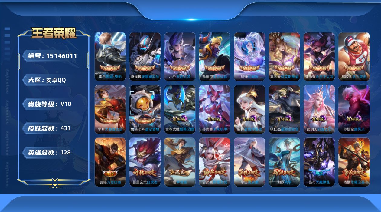 [15146011]【店主推荐捡漏号!可直接换绑】安卓Q-V10-最强王者段位-128英雄-431皮肤-10典藏皮肤-1典藏英雄-37传说-147史诗 【英雄全皮】:孙权全皮,鬼谷子全皮 【荣耀典藏】:武则天英雄,孙悟空全息碎影,武则天倪克斯神谕,夏侯惇无限飓风号,小乔天鹅之梦,孙尚香杀手不太冷,鲁班七号星空梦想,芈月大秦宣太后,程咬金活力突击,李白鸣剑曳影,貂蝉幻阙歌 【传说皮肤】:后羿神树通天,曹操万灵伏威,桑启鸣野蒿,艾琳觅芳踪,孙尚香异界灵契,曜李逍遥 ,兰陵王默契交锋,公孙离祈雪灵祝,诸葛亮时雨天司,铠绛天战甲,镜炽阳神光,虞姬启明星使,孙悟空零号赤焰,关羽武圣,曜云鹰飞将,李信一念神魔,刘备时之恋人,伽罗太华,貂蝉猫影幻舞,张良黄金白羊座,干将莫邪久胜战神,虞姬云霓雀翎,达摩黄金狮子座,百里玄策白虎志,花木兰冠军飞将,梦奇胖达荣荣,后羿黄金射手座,杨戬永曜之星,诸葛亮武陵仙君,貂蝉仲夏夜之梦,李白凤求凰,孙尚香末日机甲,宫本武藏地狱之眼,孙悟空地狱火,吕布天魔缭乱,武则天海洋之心,狄仁杰超时空战士 【限定皮肤】:蔡文姬夏日便利店,狄仁杰阴阳师,小乔纯白花嫁,虞姬凯尔特女王,赵云皇家上将,赵云引擎之心,赵云龙胆,墨子神迹守卫,妲己热情桑巴,妲己时之彼端,嬴政优雅恋人,嬴政白昼王子,孙尚香蔷薇恋人,孙尚香异界灵契,鲁班七号狮舞东方,鲁班七号乒乒小将,庄周玄嵩,庄周高山流水,高渐离死亡摇滚,阿轲迷踪丽影,钟无艳王者之锤,芈月重明,芈月白晶晶,吕布天魔缭乱,吕布猎兽之王,吕布御风骁将,周瑜真爱至上,周瑜赤莲之焰,元歌无心,夏侯惇朔风刀,甄姬幽恒,甄姬游园惊梦,曹操烛龙,曹操天狼征服者,典韦穷奇,典韦蓝屏警告,典韦岱宗,马可波罗暗影游猎,狄仁杰魔术师,狄仁杰万华元夜,达摩星际陆战队,达摩沙漠行僧,项羽海滩派对,项羽霸王别姬,老夫子圣诞老人,老夫子醍醐杖,老夫子航海奇遇记,关羽冰锋战神,关羽武圣,貂蝉逐梦之音,安琪拉魔法小厨娘,程咬金演武夺筹,露娜一生所爱,刘邦夺宝奇兵,韩信逐梦之影,韩信飞衡,王昭君凤凰于飞,兰陵王默契交锋,兰陵王驯魔猎人,兰陵王金庭之子,花木兰青春决赛季,花木兰瑞麟志,花木兰默契交锋,亚瑟潮玩骑士王,孙悟空美猴王,孙悟空至尊宝,孙悟空大圣娶亲,孙悟空零号赤焰,孙悟空孙行者,牛魔御旌,牛魔奔雷神使,后羿辉光之辰,后羿如梦令,后羿圣弓游侠,张飞虎魄,李元芳银河之约,李