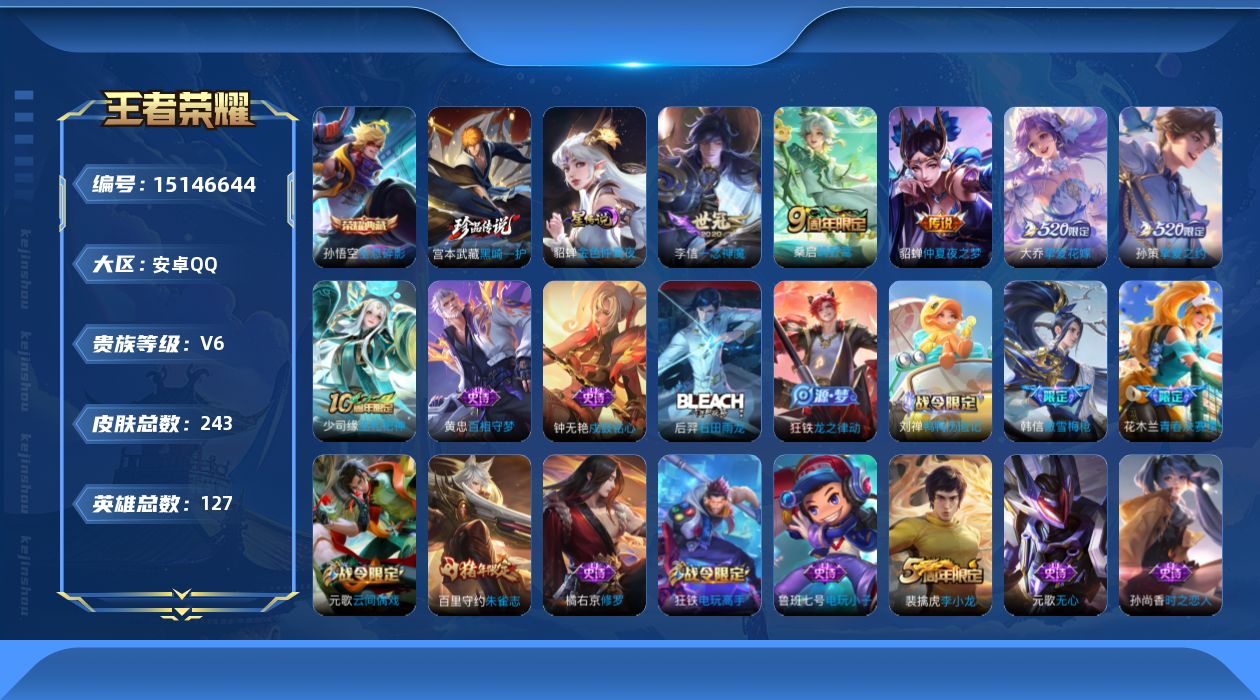 [15146644]【店主推荐捡漏号!可直接换绑】安卓Q-V6-至尊星耀IV段位-127英雄-243皮肤-1典藏皮肤-1珍品传说-5传说-54史诗 【英雄全皮】:孙权全皮,狂铁全皮,空空儿全皮,影全皮 【荣耀典藏】:孙悟空全息碎影 【珍品传说】:宫本武藏黑崎一护 【传说皮肤】:桑启鸣野蒿,大乔挚爱花嫁,孙策挚爱之约,李信一念神魔,貂蝉仲夏夜之梦 【限定皮肤】:狄仁杰阴阳师,赵云皇家上将,墨子神迹守卫,孙尚香蔷薇恋人,庄周高山流水,高渐离玩趣恶龙,白起夜都怪侠,芈月幻夜卜梦,元歌云间偶戏,元歌无心,夏侯惇朔风刀,甄姬游园惊梦,狄仁杰魔术师,狄仁杰万华元夜,达摩星际陆战队,达摩沙漠行僧,项羽海滩派对,老夫子醍醐杖,老夫子航海奇遇记,程咬金演武夺筹,韩信傲雪梅枪,王昭君午后时光,兰陵王金庭之子,花木兰青春决赛季,亚瑟潮玩骑士王,牛魔御旌,后羿圣弓游侠,李元芳云中旅人,钟馗驱傩正仪,干将莫邪真爱魔法,鬼谷子原初探秘者,鬼谷子五谷丰年,大乔挚爱花嫁,黄忠火炮绅士,苏烈千军破阵,百里守约朱雀志,弈星混沌棋,沈梦溪大漠名商,明世隐疑决卦,明世隐吟游魔法,裴擒虎李小龙,裴擒虎擒涛扼浪,狂铁御狮,狂铁电玩高手,米莱狄御霄,米莱狄胡桃异想国,云中君纤云弄巧,盾山御銮,孙策挚爱之约,上官婉儿梁祝,嫦娥拒霜思,鲁班大师探海日志,桑启海盐诗旅,张良古海寻踪,蒙犽百解令,鬼谷子天穹祈灯,刘邦剑破天穹,程咬金群星魔术团,刘备异域游侠 【年限皮肤】:百里守约朱雀志 【赛季限定】:夏侯惇朔风刀,狄仁杰万华元夜,达摩沙漠行僧,老夫子醍醐杖,程咬金演武夺筹,兰陵王金庭之子,张良古海寻踪,牛魔御旌,李元芳云中旅人,钟馗驱傩正仪,鬼谷子原初探秘者,苏烈千军破阵,弈星混沌棋,沈梦溪大漠名商,明世隐疑决卦,裴擒虎擒涛扼浪,狂铁御狮,米莱狄御霄,盾山御銮,鲁班大师探海日志,桑启海盐诗旅,鬼谷子天穹祈灯,刘邦剑破天穹 【战令限定】:墨子神迹守卫,白起夜都怪侠,芈月幻夜卜梦,元歌云间偶戏,达摩星际陆战队,老夫子航海奇遇记,王昭君午后时光,亚瑟潮玩骑士王,后羿圣弓游侠,干将莫邪真爱魔法,黄忠火炮绅士,明世隐吟游魔法,狂铁电玩高手,米莱狄胡桃异想国 【史诗皮肤】:鲁班七号电玩小子,项羽苍穹之光,赵云皇家上将,狄仁杰魔术师,宫本武藏鬼剑武藏,孙尚香蔷薇恋人,孙尚香水果甜心,嬴政暗夜贵公子,妲己魅力维加斯,妲己女仆咖啡,墨子龙骑士,韩信白龙吟