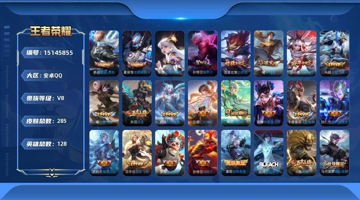 - [11879016]V8 2典藏 1珍品传说 24传说 125英雄 337皮肤 可修改实名 优质装备:全息碎影(猴子典藏),九霄神辉(木兰典藏),怪盗基德,黄金狮子座,黄金射手座,冠军飞将,久胜战神,炽阳神光,云霓雀翎,末日机甲-孙尚香(绿蚂蚱),地狱火,仲夏夜之梦(大飞蛾),地狱之眼,胖达荣荣,超时空战士-狄仁杰,无双飞将,山海·炽霜斩(李信年限),山海·苍雷引(电光曜子),电玩·雷克斯,鹤羽星尊,妄想实况 珍宝阁皮:优雅恋人,玩趣恶龙 限定皮:愿照·九州拓(澜年限),愿照·山河定(司空震年限),鸣野蒿,至尊宝,遇见飞天,齐天大圣,五谷丰年,游园惊梦,梁祝,御风骁将(吕布年限),李小龙,孙行者,大圣娶亲,引擎之心,神奇女侠,美猴王,寅虎·赤拳(老虎年限),时之祈愿-云中君,玉兔公主 史诗皮:器灵·浮梦炉,破空之剑,怒海争锋,谪仙醉月,超元猎域,紫霞仙子,苍穹之光,电玩小子(小书包),白龙吟,黄金分割率,特工魅影,千年之狐,百相守梦(刘备),电玩·爆裂旋风,真我赫兹(百里守约),江河有灵,高渐离燃音魔法,蒙恬荣光圣徽,偶像歌手,白蛇,魅语,晚萤,青蛇,末日机甲-吕布,猫狗日记-孙策,猫狗日记-大乔,乱世虎臣,节奏热浪,修罗,女仆咖啡,摇滚巨星,水果甜心,绅士熊喵,天才门将,星夜王子,心灵骇客,功夫厨神,德古拉伯爵,暗隐猎兽者,幽灵船长,鬼剑武藏,暗渊魔法,心灵战警,天秀·启明,舞动绿茵,地狱岩魂,纤云弄巧,繁星吟游(呼啦呼啦),缤纷独角兽,乘风破浪,逐浪之夏,水晶猎龙者,曙光守护者,热力回旋,箭羽风息,金属风暴,原初追逐者,圣诞狂欢,圣诞恋歌,鹰眼统帅,暗夜贵公子,魅力维加斯,黎明之约,赏金猎手,无心,未来纪元-赵云