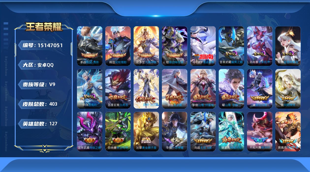 [15147051]【店主推荐捡漏号!可直接换绑】安卓Q-V9-最强王者段位-127英雄-403皮肤-4典藏皮肤-1珍品传说-32传说-121史诗 【英雄全皮】:孙权全皮,钟馗全皮,鬼谷子全皮,狂铁全皮,李信全皮,蒙恬全皮,司空震全皮,空空儿全皮,影全皮 【荣耀典藏】:李白鸣剑曳影,花木兰九霄神辉,铠银白咏叹调,韩信弑枪猎影 【珍品传说】:马可波罗怪盗基德 【传说皮肤】:司空震愿照山河定,云缨幻光神枪,裴擒虎祥瑞亨通,桑启鸣野蒿,海月金乌负日,澜逐花归海,公孙离记忆之芯,孙悟空齐天大圣,曜山海苍雷引,李信山海炽霜斩,吕布怒海麟威,狄仁杰神器狴犴令,不知火舞绯月行,王昭君星穹之声,马超无双飞将,诸葛亮时雨天司,镜炽阳神光,虞姬启明星使,李信一念神魔,刘备时之恋人,貂蝉猫影幻舞,干将莫邪久胜战神,虞姬云霓雀翎,达摩黄金狮子座,百里玄策白虎志,花木兰冠军飞将,梦奇胖达荣荣,后羿黄金射手座,貂蝉仲夏夜之梦,李白凤求凰,孙尚香末日机甲,宫本武藏地狱之眼 【限定皮肤】:白起狰,虞姬夏日便利店,姜子牙天穹之誓,狄仁杰阴阳师,虞姬凯尔特女王,赵云皇家上将,赵云龙胆,嬴政白昼王子,鲁班七号狮舞东方,庄周高山流水,高渐离死亡摇滚,高渐离玩趣恶龙,阿轲迷踪丽影,钟无艳超时空战士,扁鹊奇幻香踪,白起夜都怪侠,芈月重明,吕布猎兽之王,周瑜赤莲之焰,元歌云间偶戏,元歌无心,夏侯惇朔风刀,甄姬落雪兰心,曹操烛龙,典韦穷奇,典韦蓝屏警告,马可波罗山海玄木吟,狄仁杰魔术师,狄仁杰万华元夜,狄仁杰神器狴犴令,项羽海滩派对,老夫子圣诞老人,老夫子醍醐杖,老夫子航海奇遇记,关羽冰锋战神,程咬金演武夺筹,露娜一生所爱,刘邦夺宝奇兵,韩信飞衡,王昭君午后时光,王昭君星穹之声,兰陵王驯魔猎人,兰陵王金庭之子,不知火舞绯月行,亚瑟潮玩骑士王,孙悟空至尊宝,孙悟空大圣娶亲,孙悟空齐天大圣,牛魔御旌,后羿如梦令,李元芳银河之约,李元芳云中旅人,虞姬启明星使,钟馗神迹守卫,钟馗驱傩正仪,杨玉环遇见飞天,杨戬潮玩骑兵,女娲朔望之晖,干将莫邪冰霜恋舞曲,雅典娜黎明之约,蔡文姬繁星吟游,太乙真人华丽摇滚,东皇太一逐梦之光,鬼谷子原初探秘者,鬼谷子五谷丰年,诸葛亮时雨天司,铠青龙志,百里玄策白虎志,百里玄策原初追逐者,百里守约朱雀志,弈星混沌棋,梦奇顽趣,沈梦溪星空之诺,沈梦溪大漠名商,明世隐疑决卦,明世隐吟游魔法,裴擒虎天狼狩猎者,裴擒虎李小