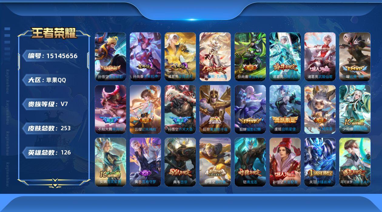 [15145656]可二次【店主推荐捡漏号!可直接换绑】苹果Q-V7-最强王者段位-126英雄-253皮肤-1典藏皮肤-13传说-3星元-71史诗