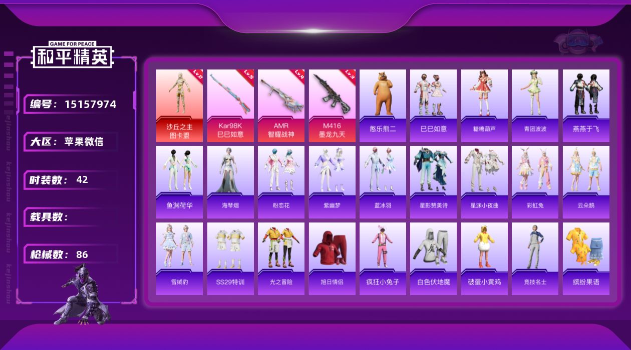 [15157974]【店主推荐捡漏号!可直接换绑】苹果 微信-1神装-0粉装-3特效枪-0载具-5粉色飞行器-23879热力值-7王牌印记-42套装-86枪皮