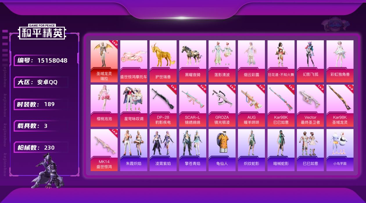 [15158048]【店主推荐捡漏号!可直接换绑】 安卓 手Q-1神装-7粉装-8特效枪-3载具-8粉色飞行器-7.9w热力值-8王牌印记-189套装-230枪皮【红色神装等级】:圣域龙灵-瑞拉(二级)【红色角色神装】:圣域龙灵-瑞拉【热门品类】:套装-SS1特训,套装-龟仙人【粉色套装】:粉装-莲影清波,角色-烟云彩露,角色-狂花道·不知火舞,粉装-幻影飞狐,角色-彩虹独角兽,角色-樱桃泡泡,粉装-星穹咏叹调【粉色枪皮等级】:SCAR-L-锦绣绵绵(五级),GROZA-镜光银凌(五级),AUG-暖羊咩咩(五级),Vector-最终圣卫者(三级),Kar98K-巳巳如意(五级),Kar98K-圣域龙灵(三级),Mk14-盛世惊鸿(三级),DP-28-豹影疾电(五级)【粉色载具】:盛世惊鸿摩托车,护世瑞兽,黑曜夜骑【粉色枪皮】:SCAR-L-锦绣绵绵,GROZA-镜光银凌,AUG-暖羊咩咩,Vector-最终圣卫者,Kar98K-巳巳如意,Kar98K-圣域龙灵,Mk14-盛世惊鸿,DP-28-豹影疾电【粉色飞行器】:酣梦熊熊飞行器,凤舞九天飞行器,万象金身飞行器,月下星之子飞行器,圣域金龙飞行器,雀灵庇佑飞行器,终晖之翼飞行器