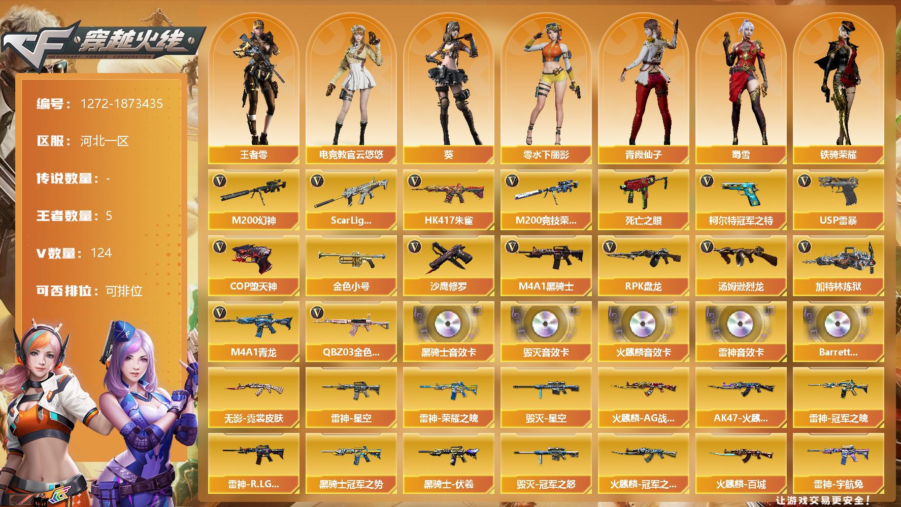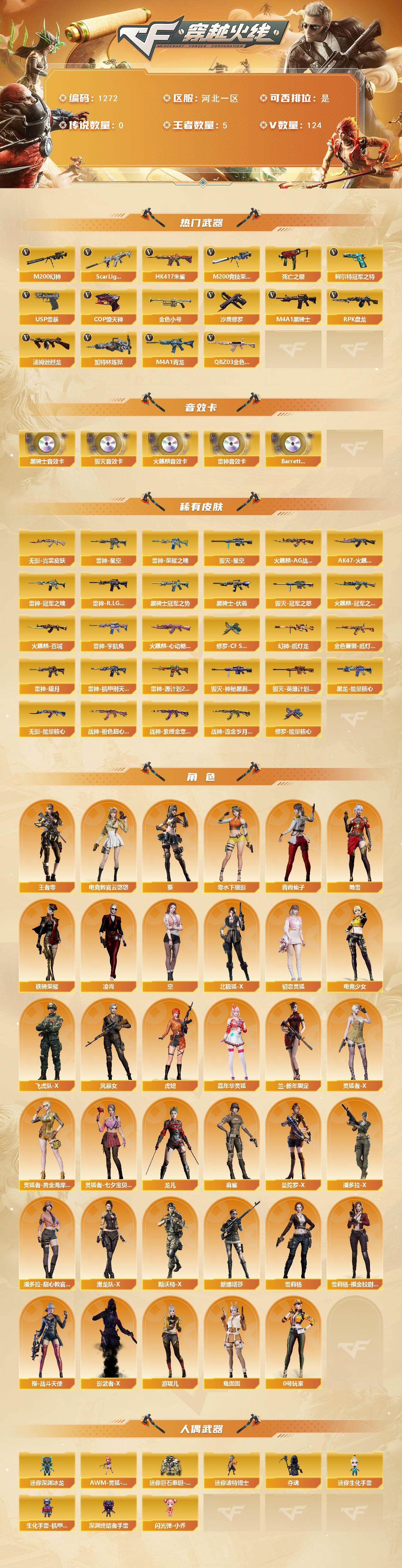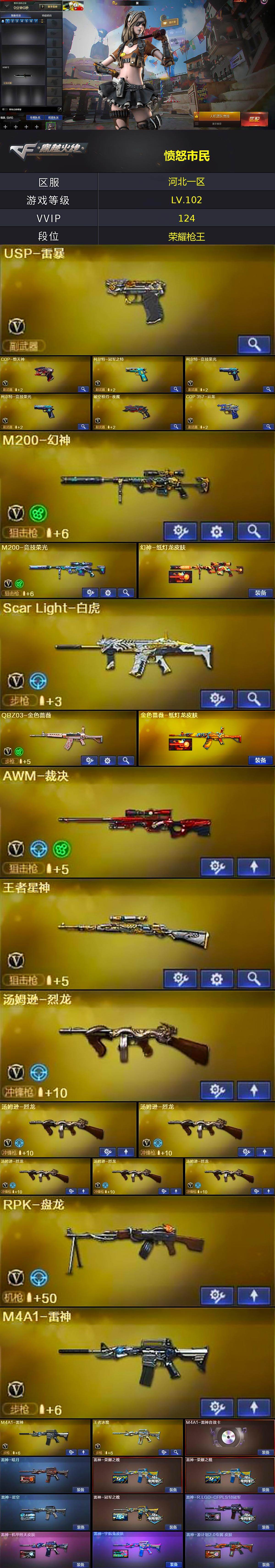 [15160557]河北一区-124V-5王者-0炫金 【热门武器】:QBZ03-金色蔷薇,Scar Light-白虎,HK417-朱雀*2,M4A1-青龙*2,M200-幻神,M200-竞技荣光,死亡之眼,柯尔特-冠军之特,金色小号,M4A1-黑骑士*2,汤姆逊-烈龙*6,RPK-盘龙,加特林-炼狱,USP-雷暴,COP-堕天神,沙鹰-修罗*4 【音效卡】:AK47-火麒麟音效卡,M4A1-雷神音效卡,M4A1