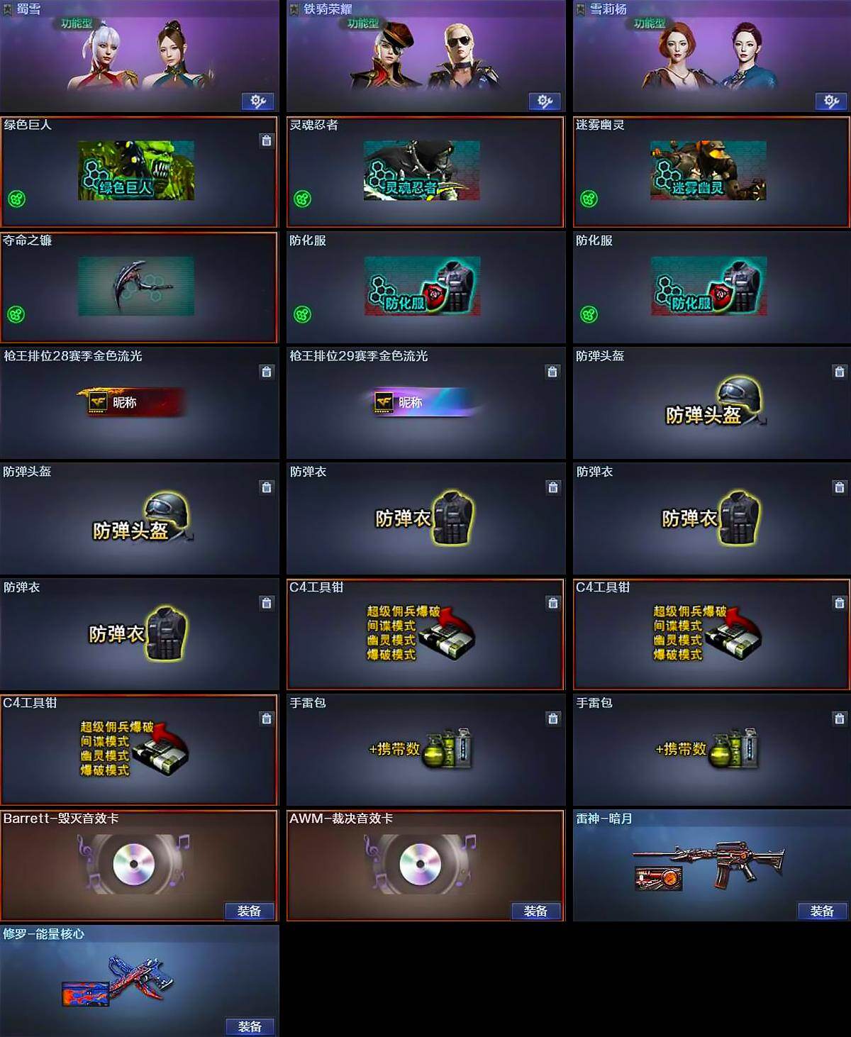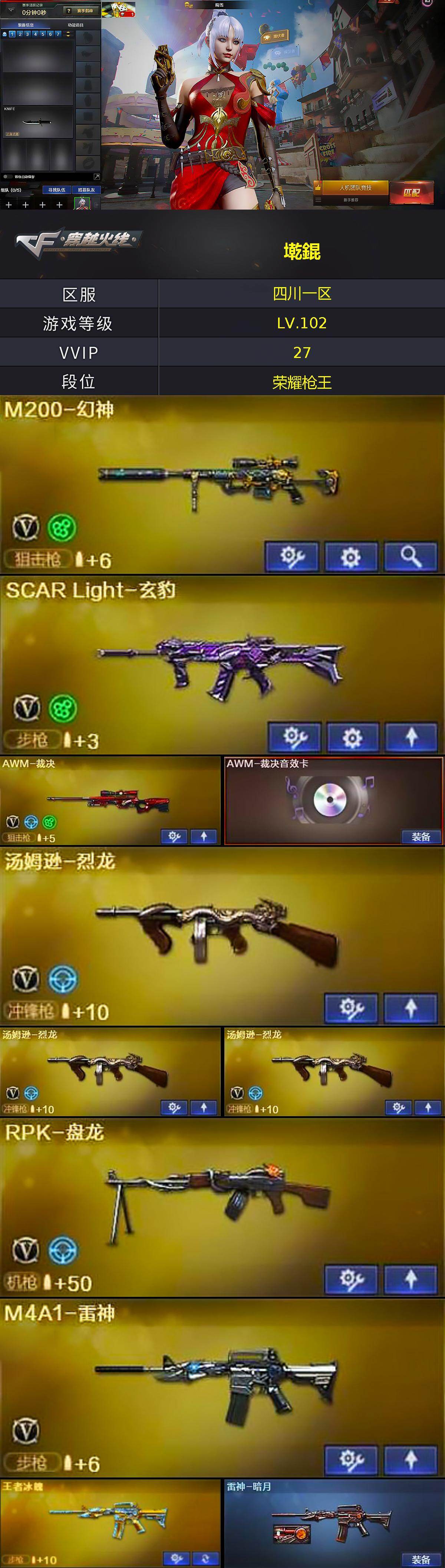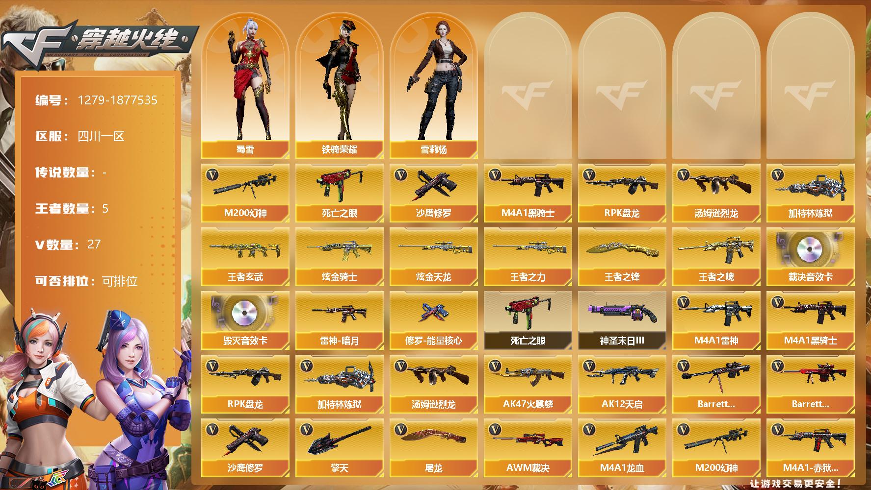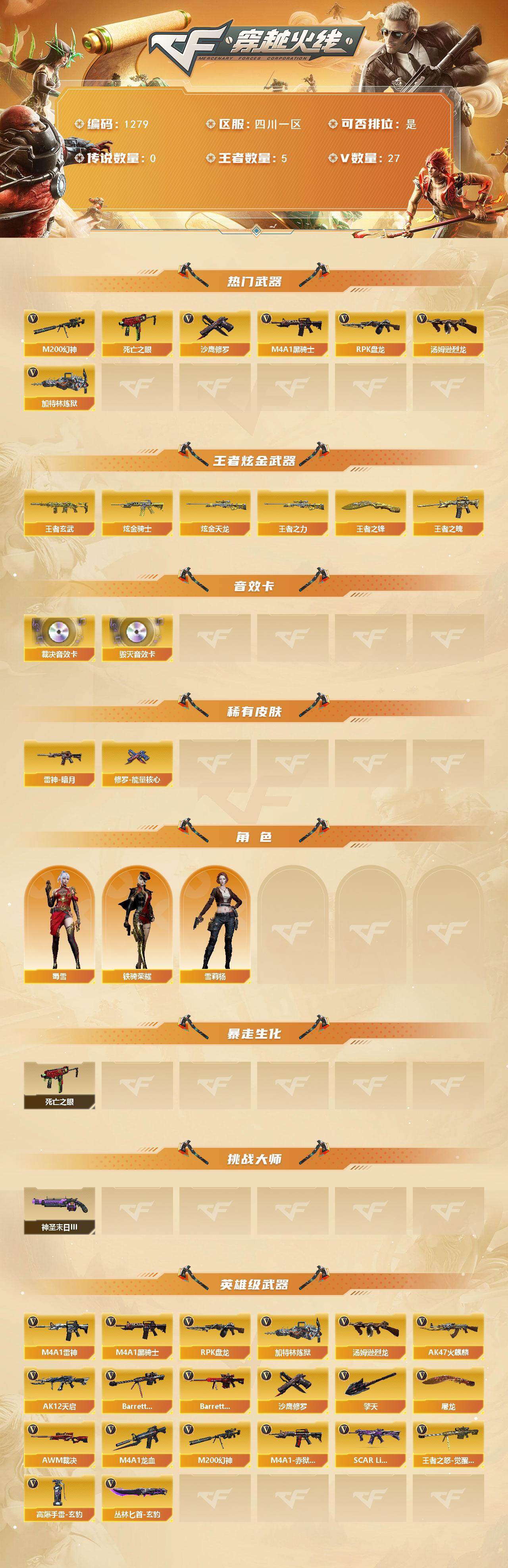 [15160668]四川一区-27V-5王者-2炫金 【热门武器】:M200-幻神,死亡之眼,M4A1-黑骑士,汤姆逊-烈龙*3,RPK-盘龙,加特林-炼狱,沙鹰-修罗*4 【王者炫金武器】:王者之魄,王者玄武,王者之力,王者之锋,炫金骑士,炫金天龙 【音效卡】:Barrett-毁灭音效卡,AWM-裁决音效卡 【皮肤】:雷神-暗月,修罗-能量核心 【角色】:蜀雪,铁骑荣耀,雪莉杨 【暴走生化】:死亡之眼 【挑战大