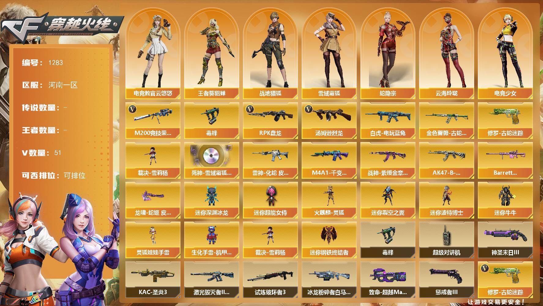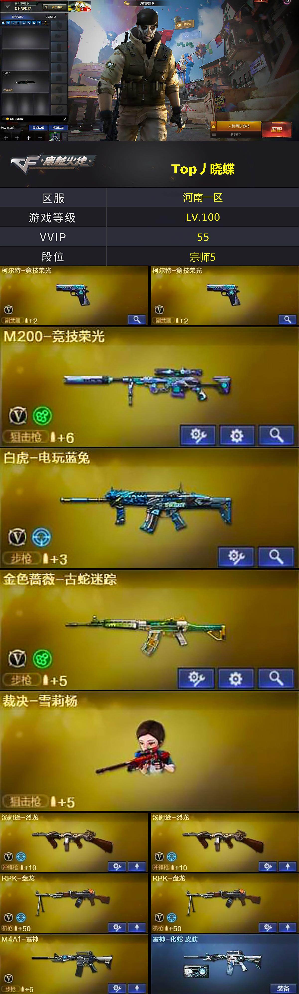 [15161087]河南一区-51V-0王者-0炫金 【热门武器】:金色蔷薇-古蛇迷踪,修罗-古蛇迷踪,M200-竞技荣光,白虎-电玩蓝兔,毒蜂,汤姆逊-烈龙*2,RPK-盘龙*2,裁决-雪莉杨 【音效卡】:死神-雪域霜狐-怀旧音效卡 【皮肤】:雷神-化蛇 皮肤,M4A1-千变-孔明皮肤,战神-紫绶金章皮肤,AK47-B-常胜将军-刘备,Barrett-金色蔷薇-蛇姬 皮肤,龙啸-蛇姬 皮肤 【角色】:电竞教官-