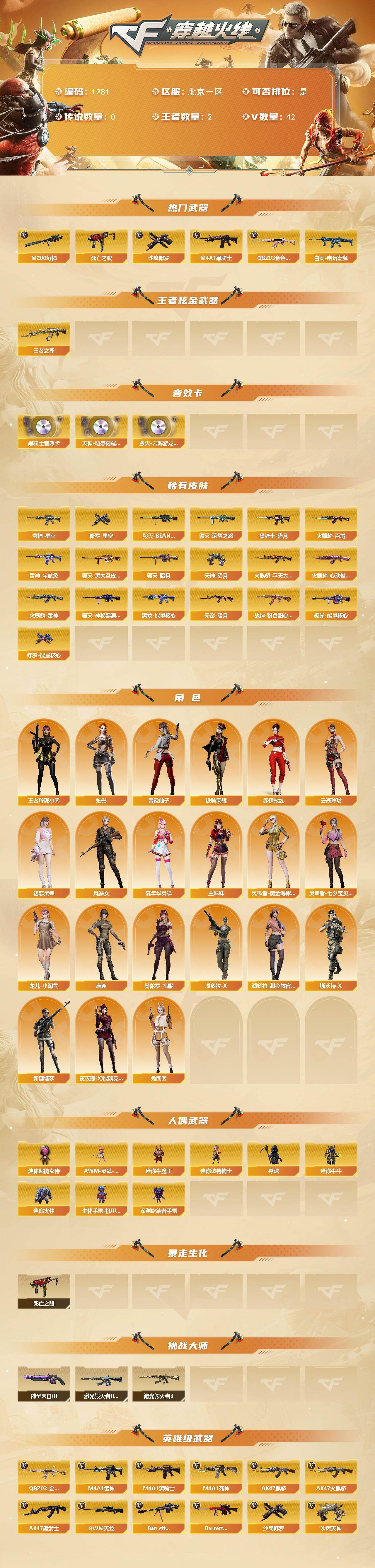 [15161422]北京一区-42V-2王者-0炫金 【热门武器】:QBZ03-金色蔷薇,M200-幻神,死亡之眼*2,白虎-电玩蓝兔,M4A1-黑骑士,沙鹰-修罗*2 【王者炫金武器】:王者之翼 【音效卡】:天神-动感闪耀 音效卡,M4A1-黑骑士音效卡,Barrett-毁灭-云海游龙音效卡 【皮肤】:雷神-星空,雷神-宇航兔皮肤,火麒麟-雷神,火麒麟-平天大圣,火麒麟-百城,火麒麟-心动糖果,毁灭-暗月*2,毁灭-荣耀之怒,毁灭-BEAN-2020MVP,毁灭-黑大圣皮肤,毁灭-神秘黑洞皮肤,黑龙-能量核心,黑骑士-暗月,无影-暗月,战神-粉色甜心皮肤,极光-能量核心,修罗-能量核心,修罗-星空,天神-暗月 【角色】:魅影,王者玲珑-小乔,乔伊教练,云海玲珑,初恋灵狐,风暴女,嘉年华灵狐,兰妹妹,灵狐者-黄金海岸,灵狐者-七夕宝贝,龙儿-小淘气,麻雀,曼陀罗-礼服,潘多拉-X,潘多拉-甜心教官,青霞仙子,斯沃特-X,铁骑荣耀,兔囡囡,新娜塔莎,夜玫瑰-幻能朋克 【人偶武器】:AWM-灵狐-15周年嘉年华,迷你牛魔王,迷你波特博士,夺魂*3,迷你牛牛,迷你火种,生化手雷-机甲核心,深渊终结者手雷,迷你超能女侍 【暴走生化】:死亡之眼*2 【挑战大师】:激光毁灭者III-白马银枪,激光毁灭者III,神圣爆裂者-末日III 【英雄级武器】:AK47-火麒麟*2,AK47-麒麟,M4A1-雷神,M4A1-黑骑士,M4A1-死神,AK47-黑武士,M4A1-武圣,AK47-机械迷城,无影-神兵利器,QBZ03-金色蔷薇,M4A1-猎神,烈火-动感闪耀,AK-47-猩红传说*2,白虎-电玩蓝兔,AWM-天龙*2,Barrett-毁灭,Barrett-极光,M200-幻神,王者星神-觉醒版,烈龙-云海游龙,AA-12-雷霆,沙鹰-修罗*2,沙鹰-天神,Glock18-武圣,天神-动感闪耀,屠龙*2,擎天,麒麟刺*3,屠龙-动感闪耀,擎天-云海游龙,手雷-动感闪耀,手雷-云海游龙 【道具】:云海游龙炫彩背包,全能枪王背包,次元之矛-黄金背包,炫彩背包,黄金超能特工背包,夺命之镰,防化服,金色流光-枪王排位*2,星辰流光-枪王排位,电玩兔兔表情,斯沃特表情,动感闪耀表情,云海游龙表情,防弹头盔*2,防弹衣*2,C4工具钳*3,手雷包*2 【特殊枪械】:1黑骑士