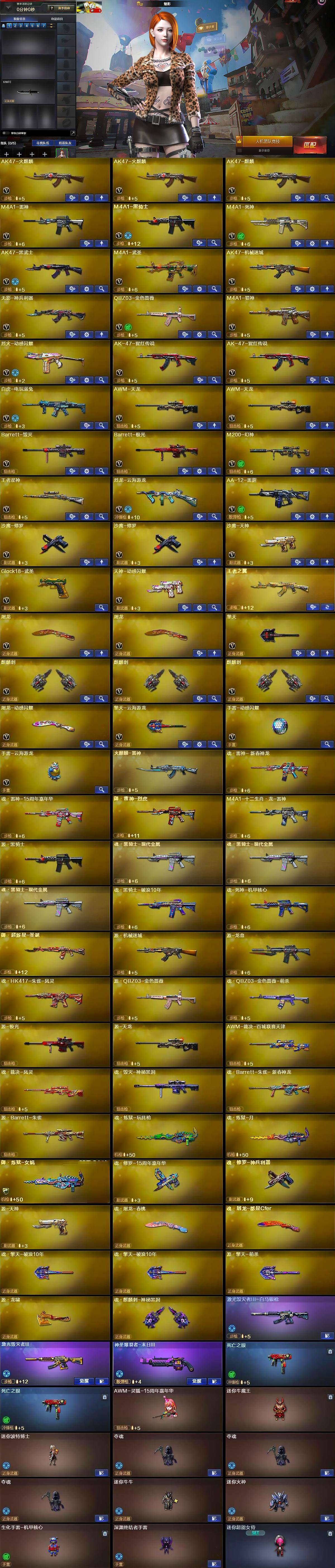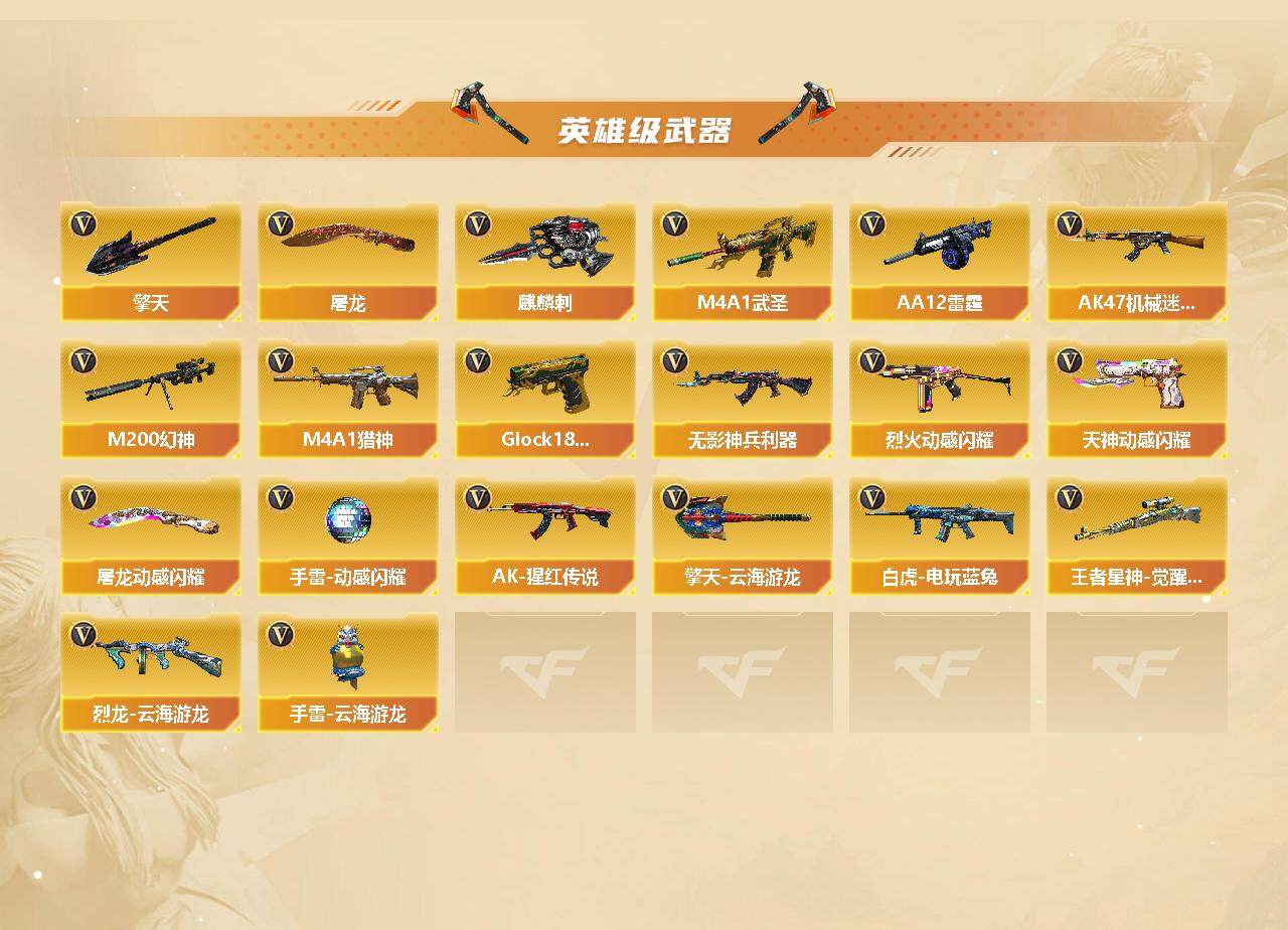 【英雄级武器】:AK47-火麒麟*2,AK47-麒麟,M4A1-雷神,M4A1-黑骑士,M4A1-死神,AK47-黑武士,M4A1-武圣,AK47-机械迷城,无影-神兵利器,QBZ03-金色蔷薇,M4A1-猎神,烈火-动感闪耀,AK-47-猩红传说*2,白虎-电玩蓝兔,AWM-天龙*2,Barrett-毁灭,Barrett-极光,M200-幻神,王者星神-觉醒版,烈龙-云海游龙,AA-12-雷霆,沙鹰-修罗*2,沙鹰-天神,Glock18-武圣,天神-动感闪耀,屠龙*2,擎天,麒麟刺*3,屠龙-动感闪耀,擎天-云海游龙,手雷-动感闪耀,手雷-云海游龙