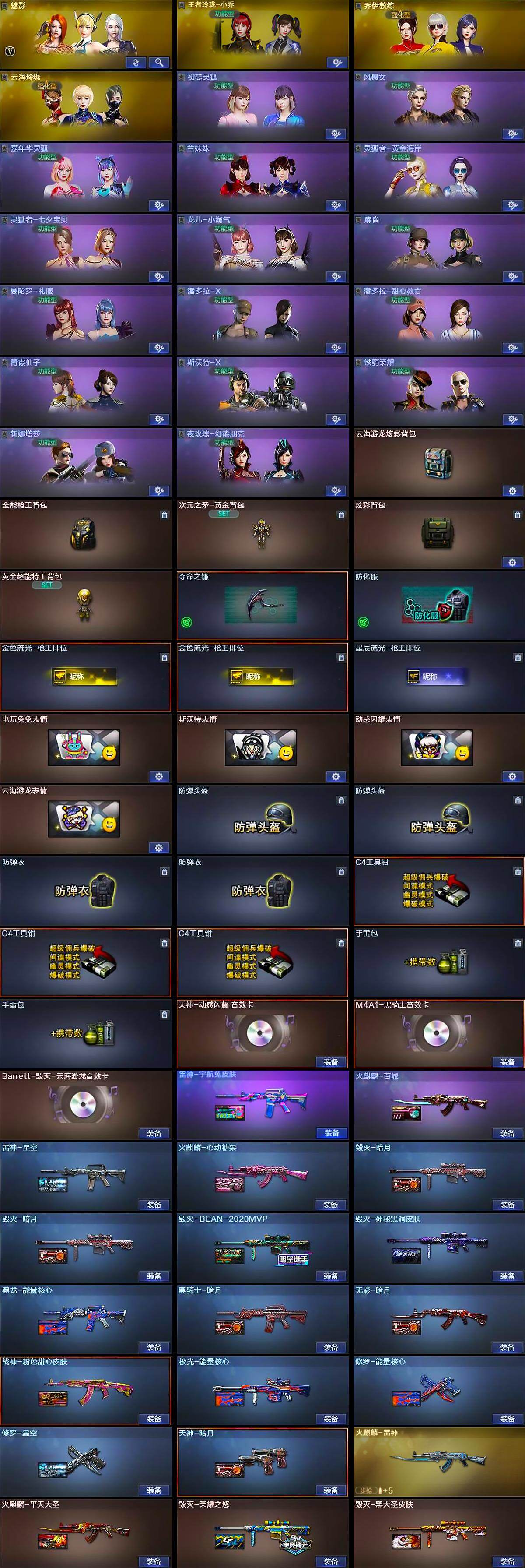 【道具】:云海游龙炫彩背包,全能枪王背包,次元之矛-黄金背包,炫彩背包,黄金超能特工背包,夺命之镰,防化服,金色流光-枪王排位*2,星辰流光-枪王排位,电玩兔兔表情,斯沃特表情,动感闪耀表情,云海游龙表情,防弹头盔*2,防弹衣*2,C4工具钳*3,手雷包*2