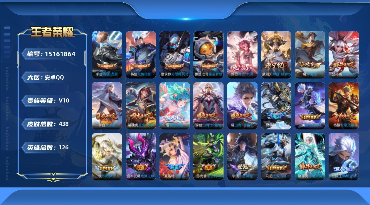 - [15152402]安卓Q-V7-至尊星耀I段位-125英雄-168皮肤-1典藏-1传说-44史诗 【荣耀典藏】:韩信弑枪猎影 【传说皮肤】:赵云淬星耀世 【限定皮肤】:白起狰,狄仁杰阴阳师,虞姬凯尔特女王,赵云皇家上将,墨子神迹守卫,嬴政白昼王子,孙尚香蔷薇恋人,庄周高山流水,孙膑妖精王,扁鹊炼金王,芈月重明,吕布猎兽之王,元歌云间偶戏,夏侯惇朔风刀,甄姬游园惊梦,曹操烛龙,典韦穷奇,狄仁杰魔术师,狄仁杰万华元夜,达摩星际陆战队,达摩沙漠行僧,项羽海滩派对,老夫子醍醐杖,老夫子航海奇遇记,程咬金演武夺筹,兰陵王金庭之子,亚瑟潮玩骑士王,牛魔御旌,李元芳云中旅人,钟馗驱傩正仪,杨玉环遇见飞天,雅典娜黎明之约,太乙真人饕餮,鬼谷子原初探秘者,鬼谷子五谷丰年,苏烈千军破阵,百里玄策原初追逐者,弈星混沌棋,梦奇顽趣,沈梦溪大漠名商,明世隐疑决卦,裴擒虎擒涛扼浪,狂铁御狮,米莱狄御霄,米莱狄胡桃异想国,盾山御銮,上官婉儿梁祝,鲁班大师探海日志,桑启海盐诗旅,张良古海寻踪,蒙恬荣光圣徽,鬼谷子天穹祈灯 【赛季限定】:孙膑妖精王,扁鹊炼金王,白起狰,芈月重明,夏侯惇朔风刀,曹操烛龙,典韦穷奇,狄仁杰万华元夜,达摩沙漠行僧,老夫子醍醐杖,程咬金演武夺筹,兰陵王金庭之子,张良古海寻踪,牛魔御旌,李元芳云中旅人,虞姬凯尔特女王,钟馗驱傩正仪,雅典娜黎明之约,太乙真人饕餮,鬼谷子原初探秘者,苏烈千军破阵,百里玄策原初追逐者,弈星混沌棋,梦奇顽趣,沈梦溪大漠名商,明世隐疑决卦,裴擒虎擒涛扼浪,狂铁御狮,米莱狄御霄,盾山御銮,鲁班大师探海日志,桑启海盐诗旅,鬼谷子天穹祈灯,蒙恬荣光圣徽 【战令限定】:墨子神迹守卫,嬴政白昼王子,吕布猎兽之王,元歌云间偶戏,达摩星际陆战队,老夫子航海奇遇记,亚瑟潮玩骑士王,米莱狄胡桃异想国 【史诗皮肤】:赵云皇家上将,赵云未来纪元,貂蝉圣诞恋歌,甄姬冰雪圆舞曲,王昭君偶像歌手,狄仁杰魔术师,廉颇地狱岩魂,宫本武藏鬼剑武藏,孙尚香蔷薇恋人,孙尚香水果甜心,嬴政摇滚巨星,妲己魅力维加斯,墨子金属风暴,吕布圣诞狂欢,刘禅绅士熊喵,曹操幽灵船长,吕布末日机甲,张飞乱世虎臣,兰陵王暗隐猎兽者,诸葛亮黄金分割率,甄姬游园惊梦,雅典娜冰冠公主,安琪拉心灵骇客,百里守约特工魅影,李元芳逐浪之夏,程咬金功夫厨神,白起星夜王子,杨玉环遇见飞天,嬴政白昼王子,孙策猫狗日记,狄仁杰鹰眼统帅,上官婉儿