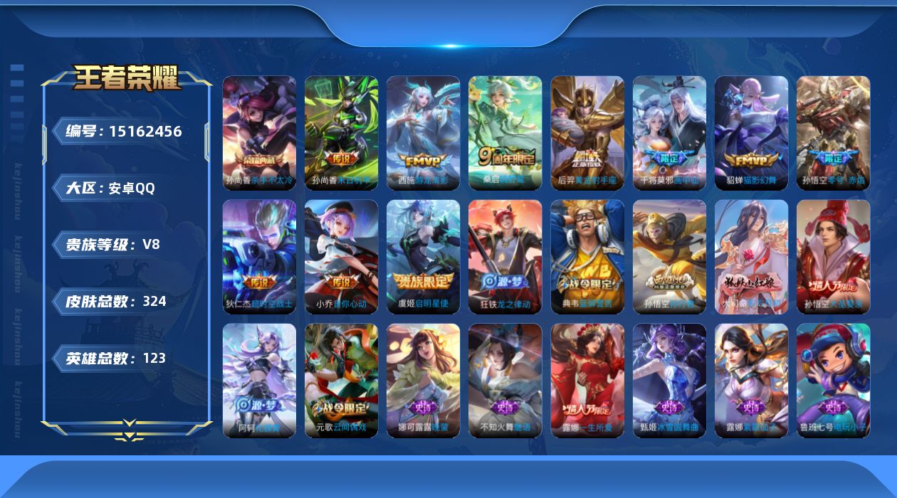 - PX_2064545-贵族等级: V8 英雄数: 123 皮肤数: 293 荣耀水晶: 武则天,无限飓风号 星传说: 幻海之心,未来机甲,金色仲夏夜 传说皮: 黄金狮子座,黄金射手座,云鹰飞将,久胜战神,炽阳神光,一念神魔,末日机甲-孙尚香,仲夏夜之梦,零号·赤焰,海洋之心,淬星耀世,超时空战士-狄仁杰,澜逐花归海,幻光神枪 限定皮: 冰锋战神,遇见飞天,李小龙,游园惊梦,梁祝,时雨天司,武圣,天