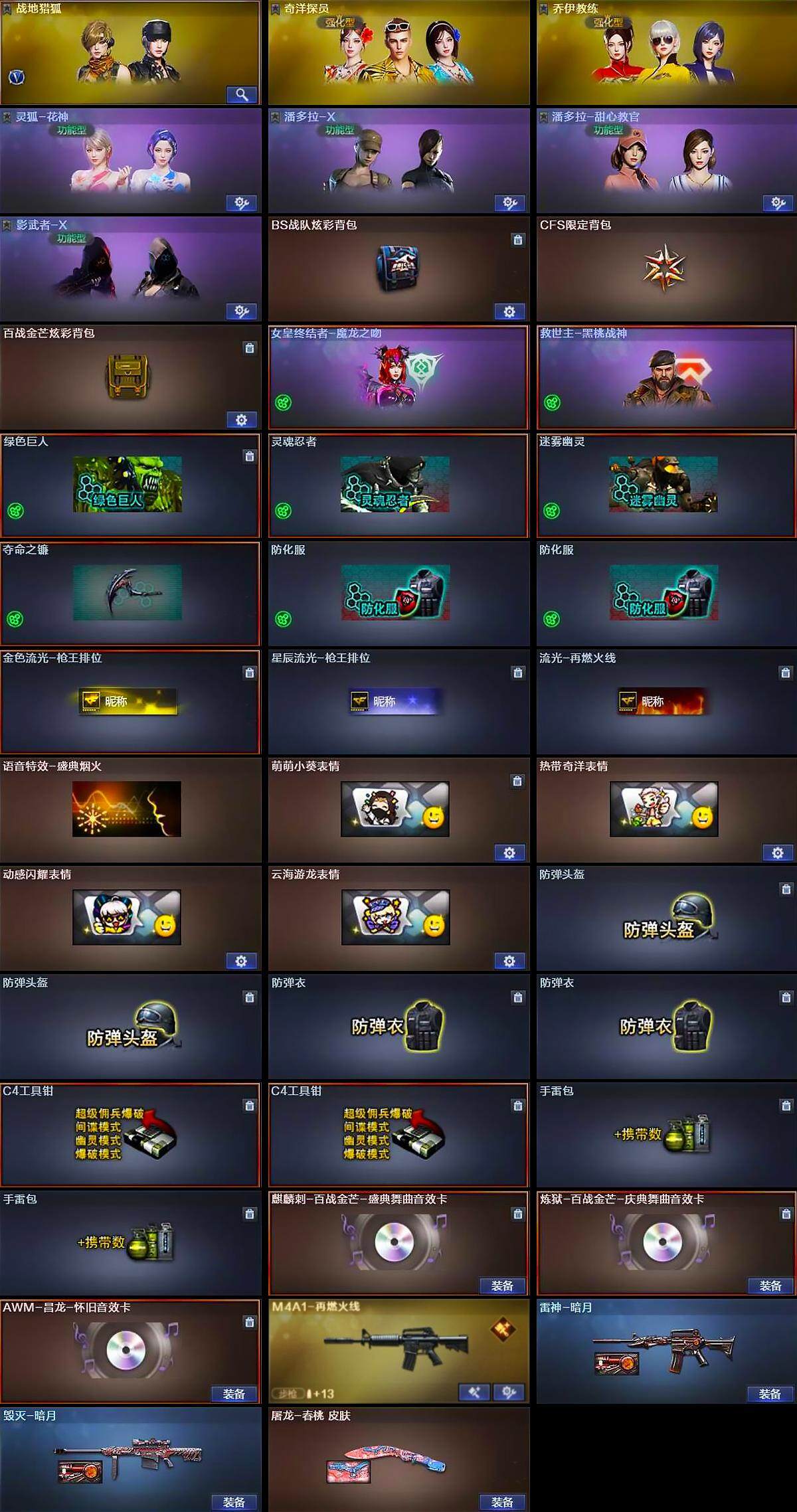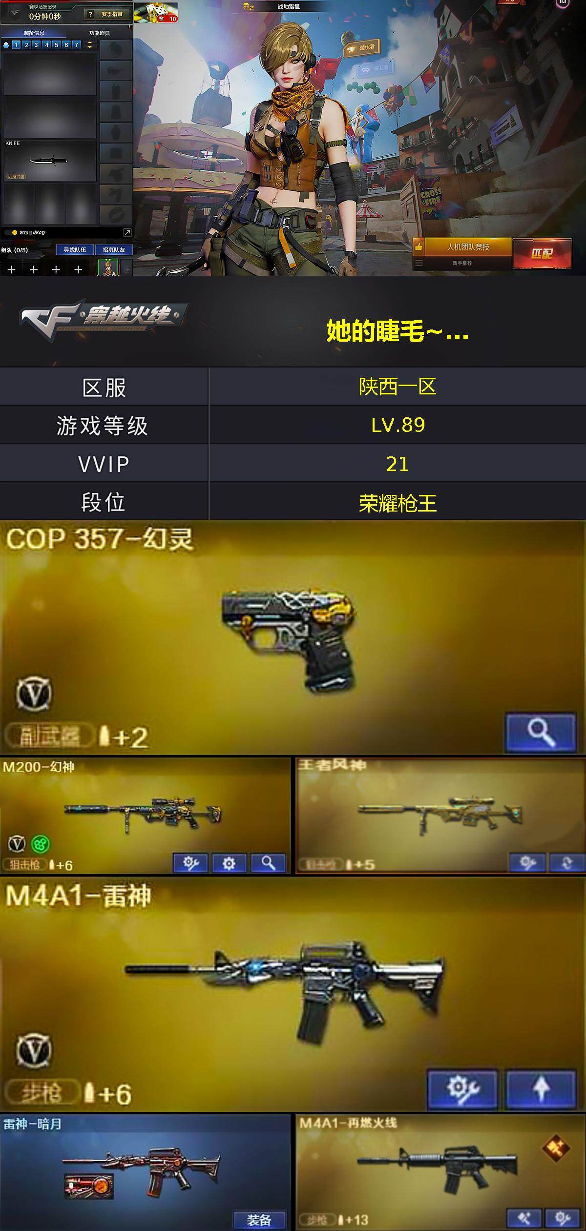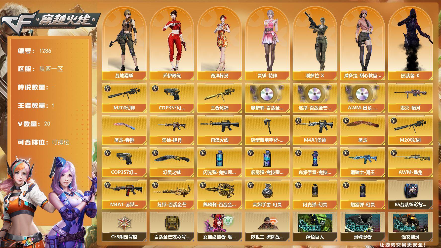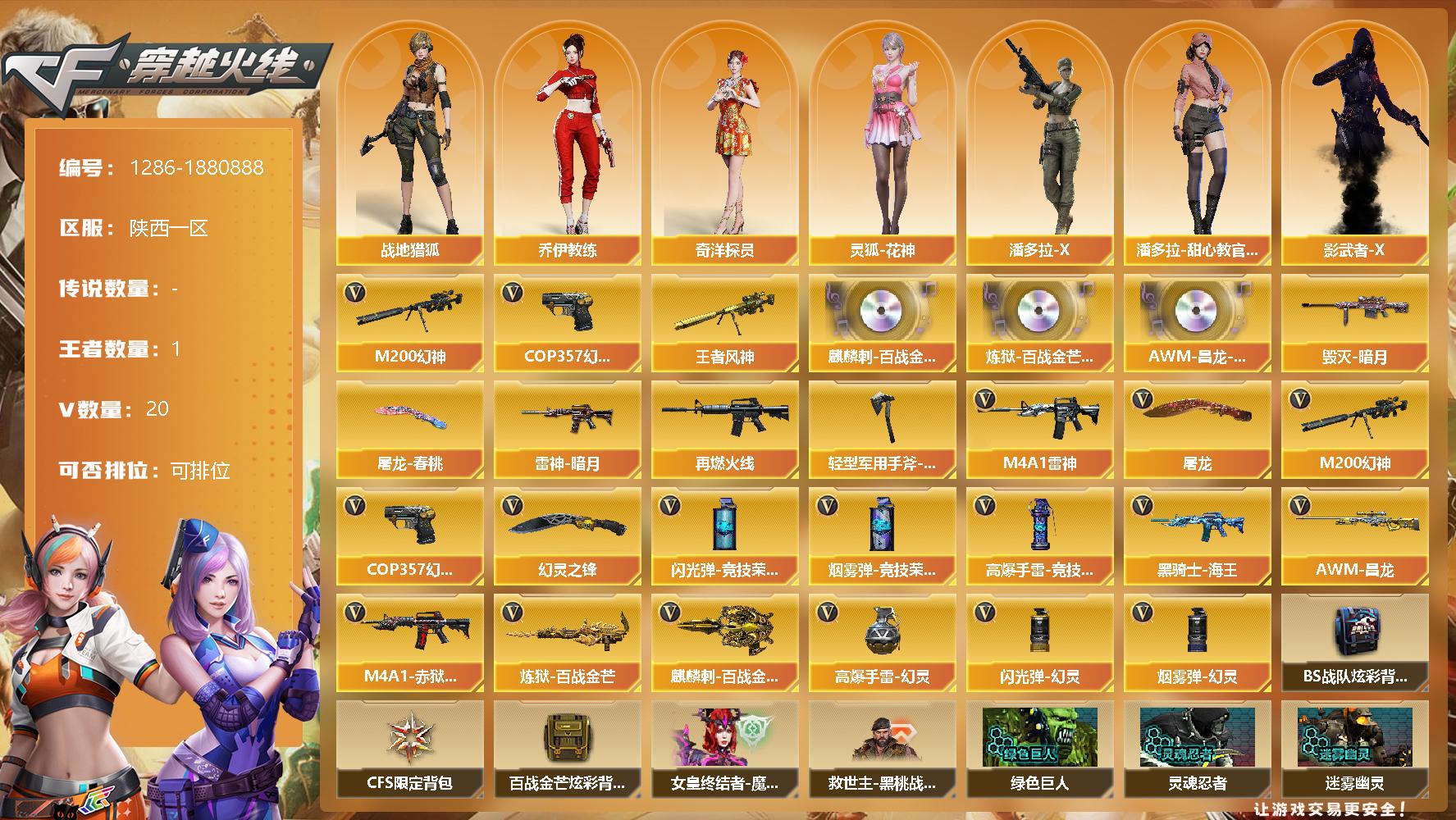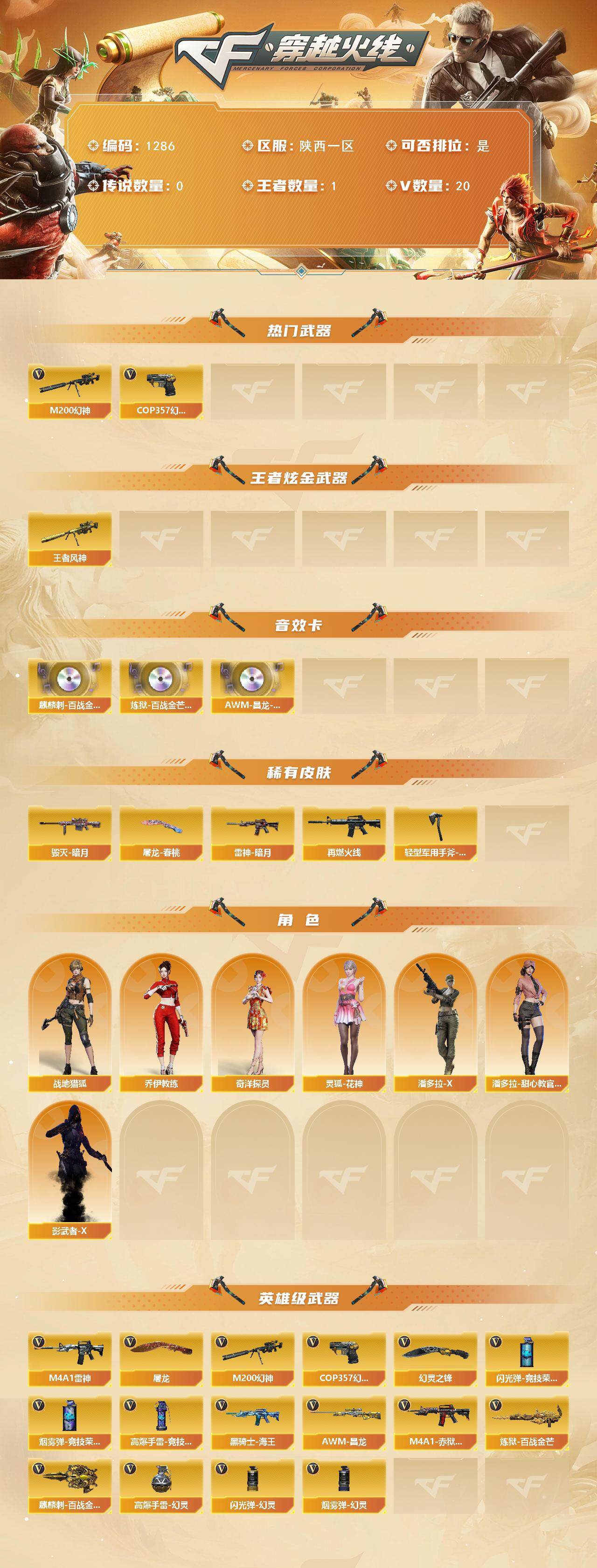[15163557]陕西一区-20V-1王者-0炫金 【热门武器】:M200-幻神,COP 357-幻灵 【王者炫金武器】:王者风神 【音效卡】:麒麟刺-百战金芒-盛典舞曲音效卡,炼狱-百战金芒-庆典舞曲音效卡,AWM-昌龙-怀旧音效卡 【皮肤】:雷神-暗月,M4A1-再燃火线,毁灭-暗月,屠龙-春桃 皮肤,轻型军用手斧-再燃火线 【角色】:战地猎狐,奇洋探员,乔伊教练,灵狐-花神,潘多拉-X,潘多拉-甜心教官,