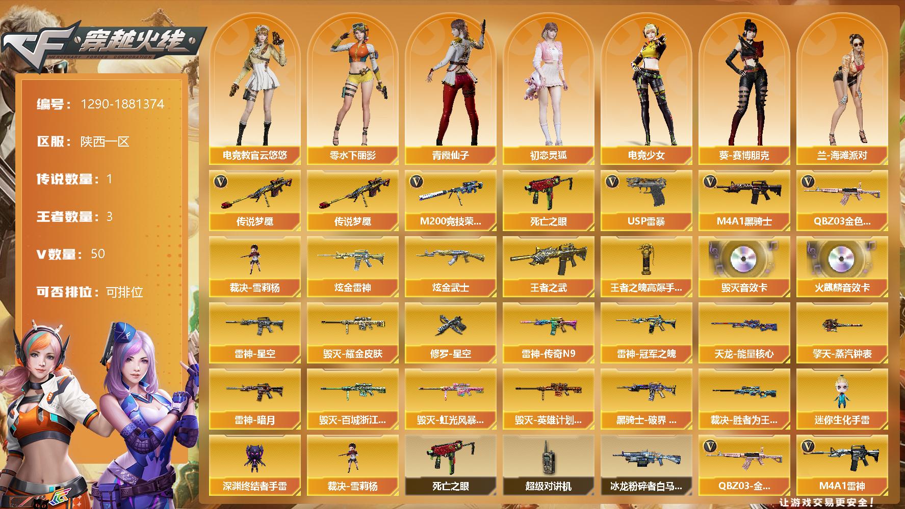 [15163752]陕西一区-50V-3王者-2炫金 【传说武器】:传说梦魇 【热门武器】:传说梦魇,QBZ03-金色蔷薇,M200-竞技荣光,死亡之眼,M4A1-黑骑士*2,裁决-雪莉杨,USP-雷暴 【王者炫金武器】:王者之武,炫金雷神,炫金武士,王者之魄高爆手雷 【音效卡】:AK47-火麒麟音效卡,Barrett-毁灭音效卡 【皮肤】:裁决-胜者为王 皮肤,雷神-暗月,雷神-星空,雷神-冠军之魄,雷神-传奇