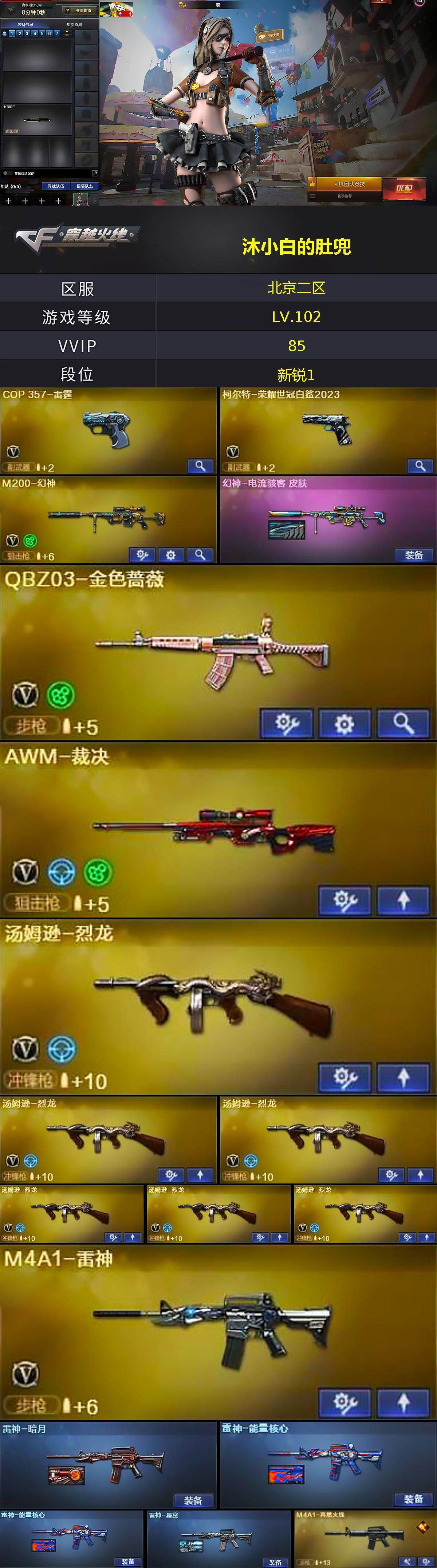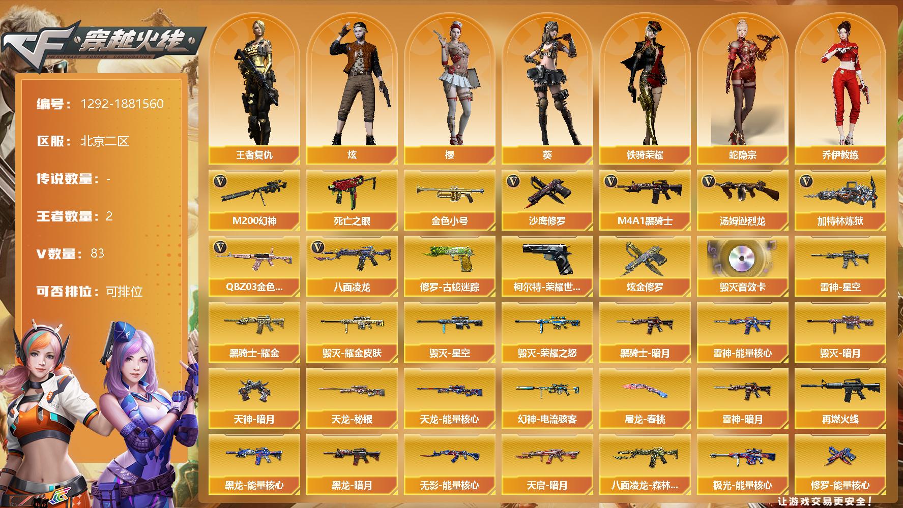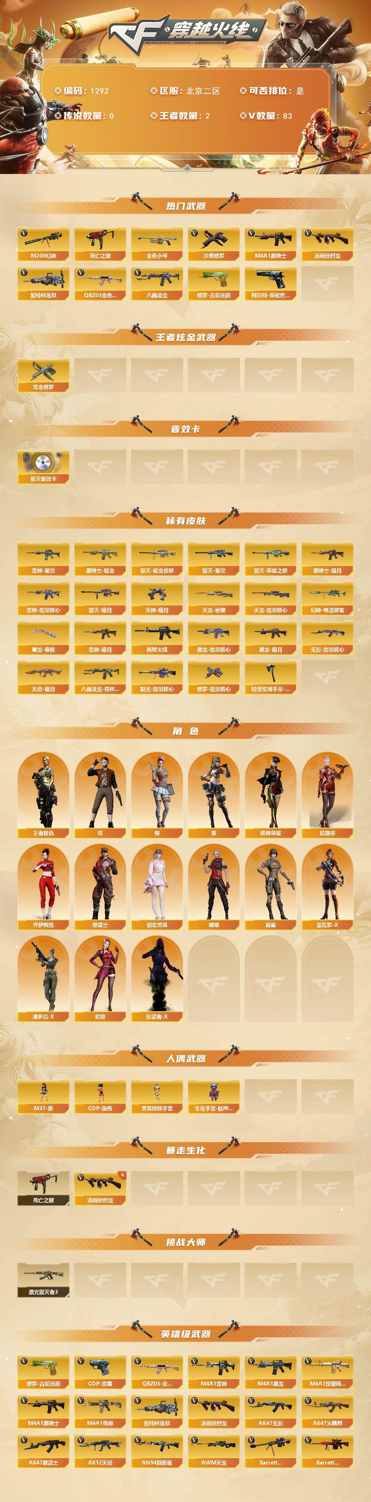 - [14394041]北京一区-149V-10王者-3炫金 【传说武器】:传说光耀(序列号版),传说光耀 【热门武器】:传说光耀,M200-幻神,荣耀世冠-柯尔特*2,Kar98K-星神,M4A1-黑骑士,汤姆逊-烈龙*6,RPK-盘龙*5,加特林-炼狱*2,斯泰尔-蝴蝶,火麒麟-绝迹,USP-雷暴,COP-堕天神*2,沙鹰-修罗*12,荣耀世冠-龙啸*2,金刚伞 【王者炫金武器】:王者凌虎,炫金黑龙,炫金千变,炫金毁灭 【音效卡】:M200-幻神音效卡,AK47-火麒麟音效卡,M4A1-黑骑士音效卡,Barrett-毁灭音效卡,绝迹语音包,Barrett-碧霄极光音效卡 【皮肤】:幻神-周瑜皮肤,幻神-AG-CFPLS17冠军,幻神-CFS2022,雷神-暗月,雷神-荣耀之魄,雷神-星空,雷神-虎将,火麒麟-冠军之心,火麒麟-平天大圣,火麒麟-百城,毁灭-冠军之怒,毁灭-风暴,黑骑士-冠军之势,黑骑士-地狱火,AWM-天龙-传奇70KG,AWM-天龙-传奇白鲨,修罗-冠军之魂,屠龙-荣耀之锋,屠龙-荣耀世冠AG 【角色】:迷迭香,战地猎狐,王者春,王者玲珑,修道士,暗夜-X,初恋灵狐,芳心审判者,风暴女,娟娟,兰-海滩派对,兰-新年限定,灵狐者-X,灵狐者-黄金海岸,灵狐者-职业经理,龙儿,曼陀罗-X,潘多拉-X,潘多拉-甜心教官,潜龙队-X,铁骑荣耀,新灵狐者,樱-缤纷夏日,影武者-X,职业选手 【人偶武器】:火麒麟-绝迹,斯泰尔-蝴蝶,AWM-灵狐-15周年嘉年华,M37-葵,迷你深渊冰龙,迷你牛魔王,生化手雷-机甲核心*2,灵狐娃娃手雷 【暴走生化】:超级对讲机 【挑战大师】:神圣爆裂者III,AK47-冰龙粉碎者,激光毁灭者III-白马银枪,VEPR-12-金魔,激光毁灭者III 【英雄级武器】:AK47-火麒麟,M4A1-黑龙*2,M4A1-雷神,M4A1-黑骑士,AK47-无影*6,AK12-天启,AK47-黑鲨,M4A1-龙血*3,AK47-雷暴*2,M4A1-猎神*7,王者之心-觉醒版*2,王者之势-觉醒版,AK-47-猩红传说,黑骑士-海王*2,QBZ-03-王者蔷薇-觉醒版,黑武士-CF网剧冠军,AWM-天龙,Barrett-毁灭,Barrett-极光*3,M200-幻神,Barrett-朱雀,Kar98K-星神,王者幻神-觉醒版,RPK-盘龙*5,加特林-炼狱*
