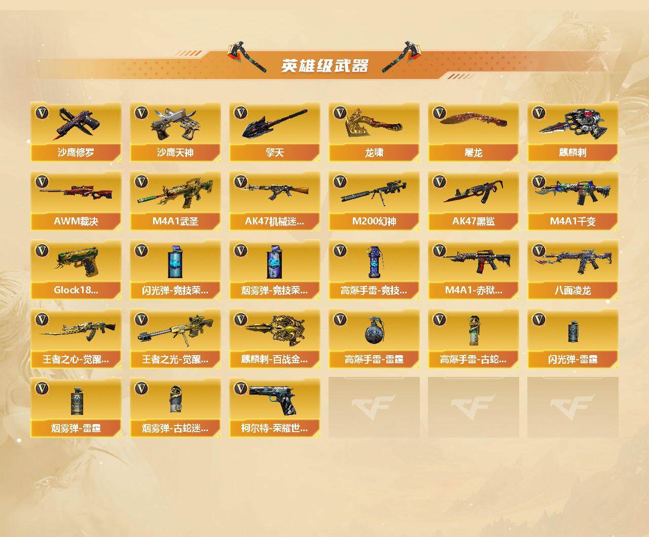【热门武器】:QBZ03-金色蔷薇,M200-幻神,柯尔特-荣耀世冠白鲨2023,修罗-古蛇迷踪,八面凌龙,死亡之眼,金色小号,M4A1-黑骑士,汤姆逊-烈龙*6,加特林-炼狱,沙鹰-修罗*5