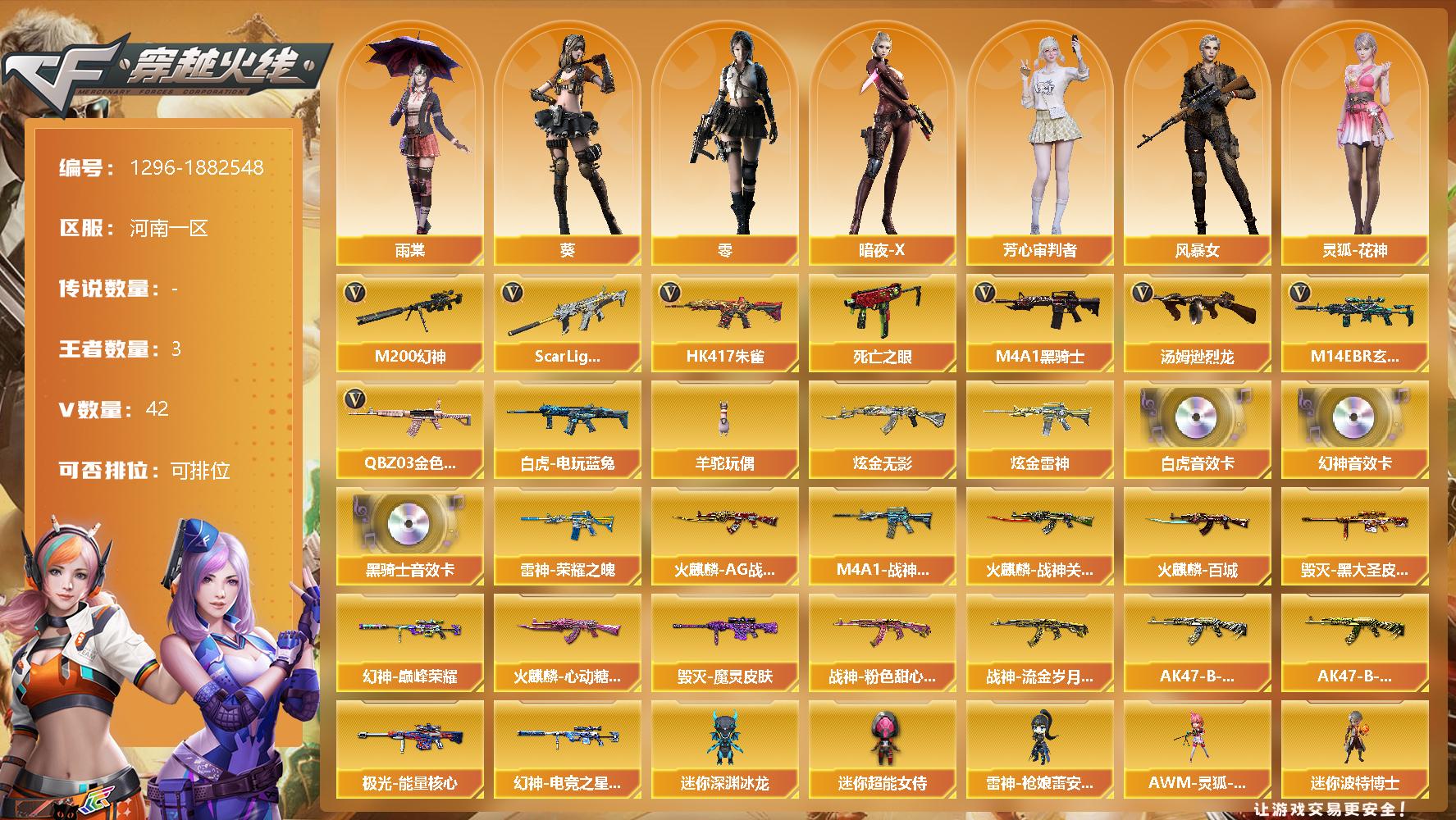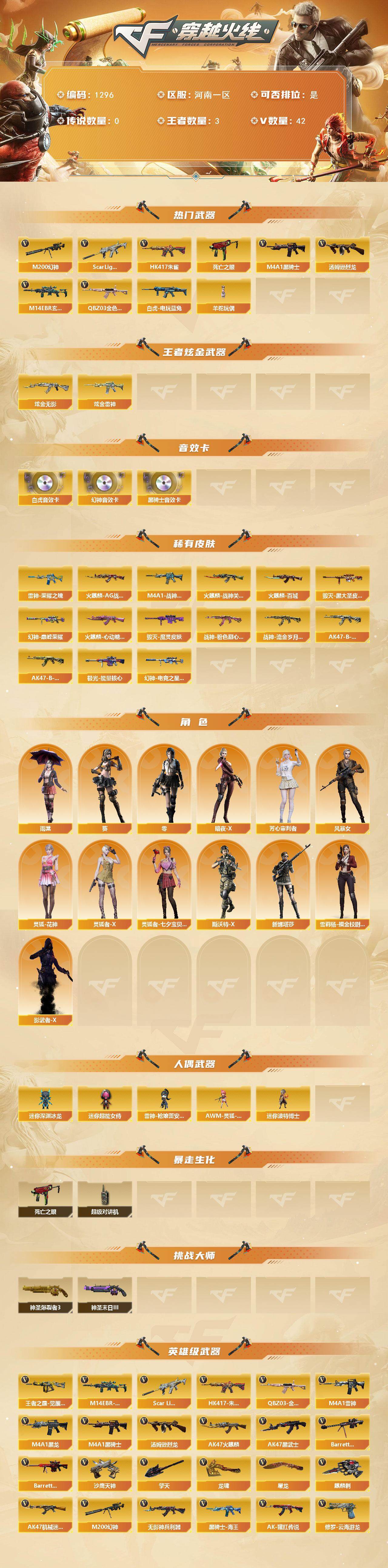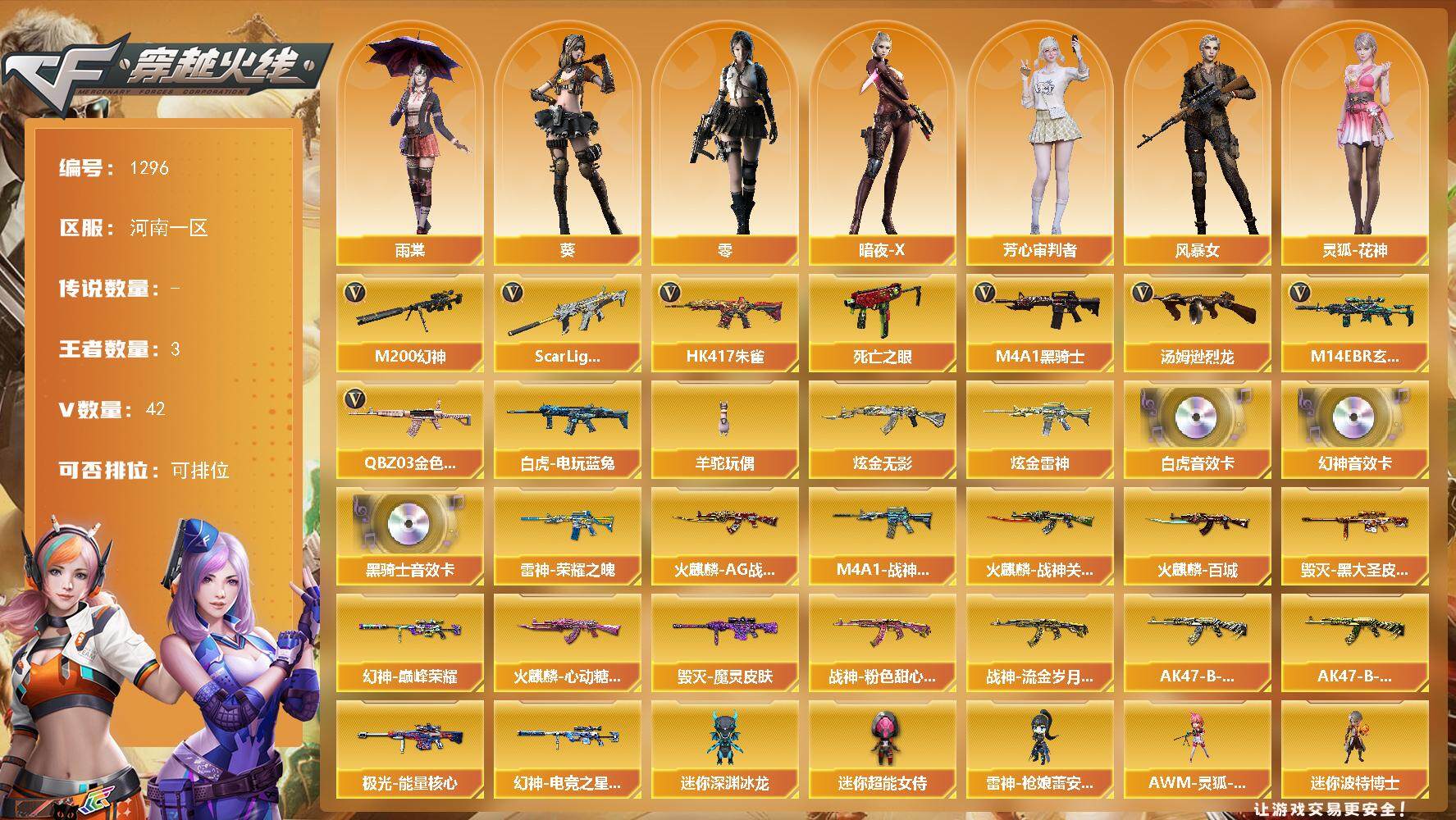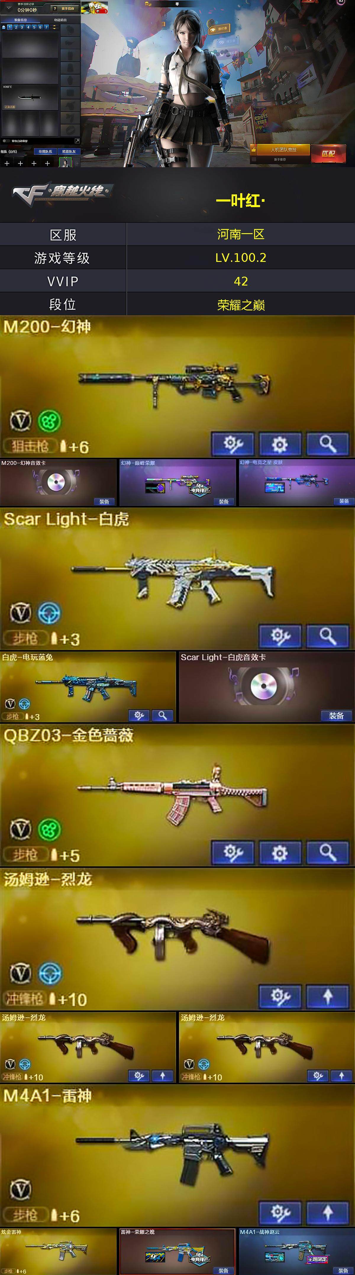 [15165035]河南一区-42V-3王者-2炫金 【热门武器】:QBZ03-金色蔷薇,M14EBR-玄武,Scar Light-白虎,HK417-朱雀,M200-幻神,死亡之眼,白虎-电玩蓝兔,M4A1-黑骑士,汤姆逊-烈龙*3,羊驼玩偶 【王者炫金武器】:炫金无影,炫金雷神 【音效卡】:M200-幻神音效卡,M4A1-黑骑士音效卡,Scar Light-白虎音效卡 【皮肤】:幻神-巅峰荣耀,幻神-电竞之星
