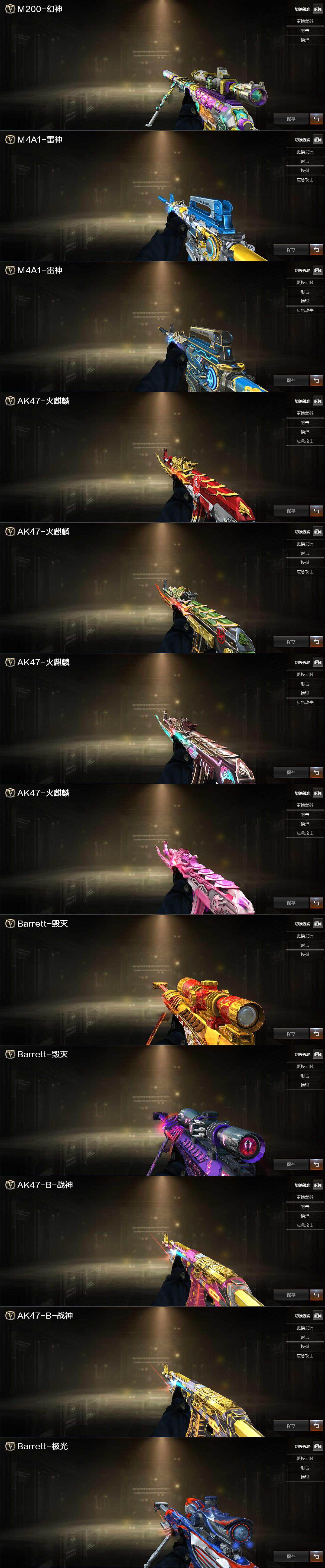 【热门武器】:QBZ03-金色蔷薇,M14EBR-玄武,Scar Light-白虎,HK417-朱雀,M200-幻神,死亡之眼,白虎-电玩蓝兔,M4A1-黑骑士,汤姆逊-烈龙*3,羊驼玩偶