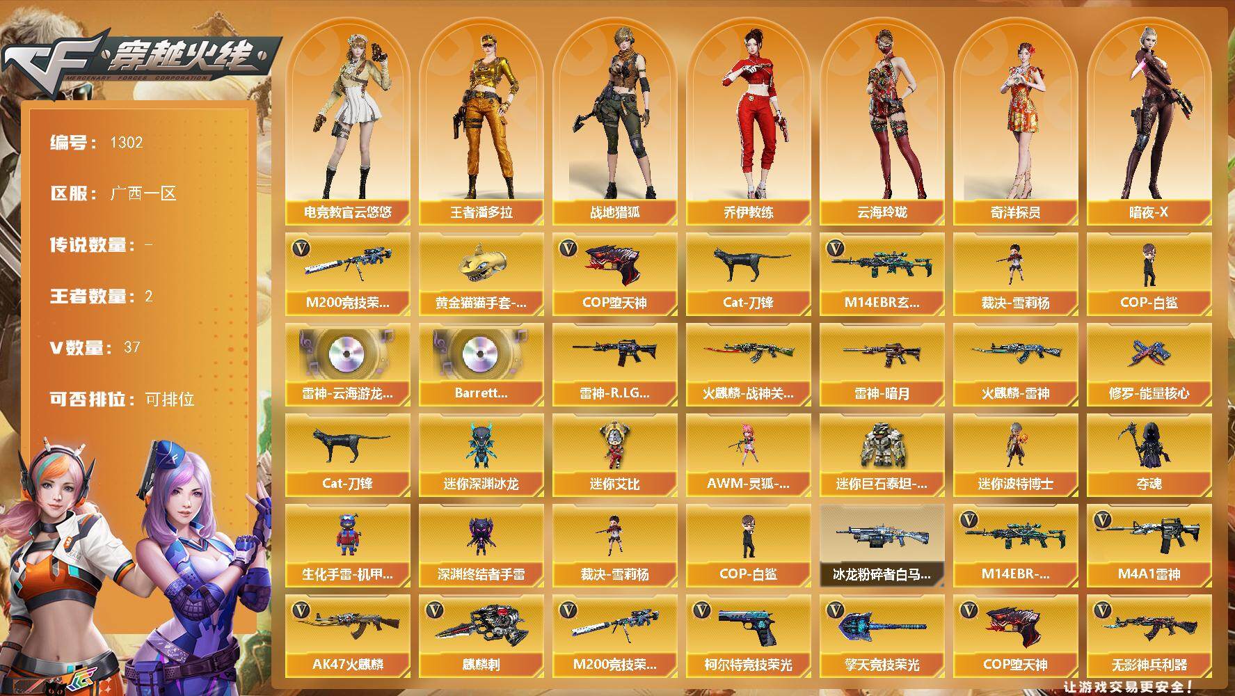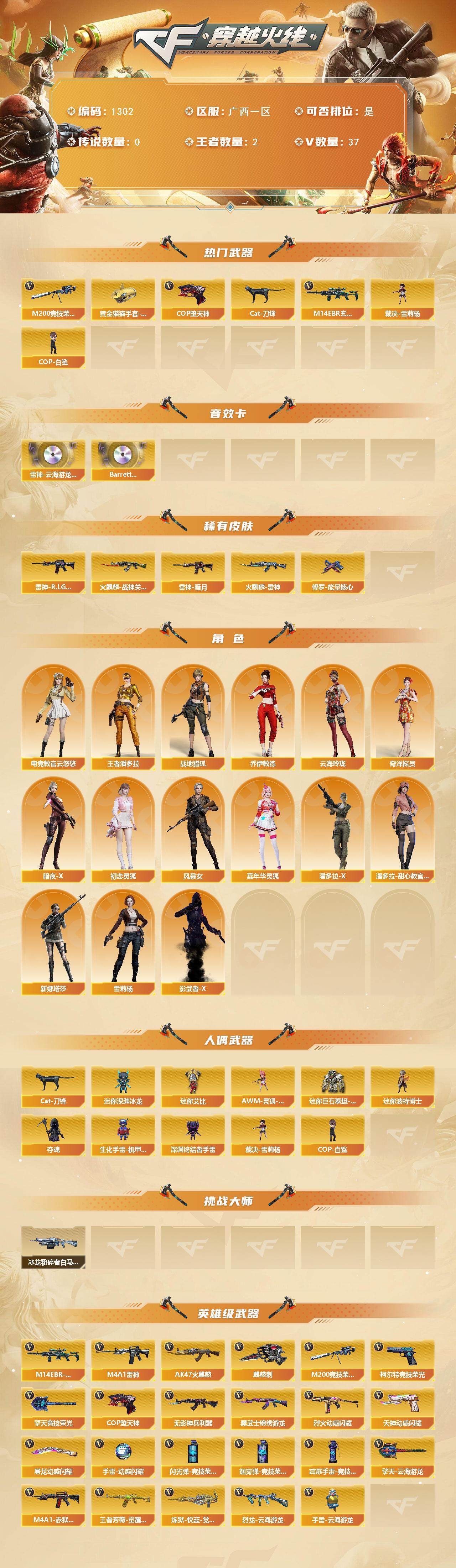 [15165163]广西一区-37V-2王者-0炫金 【热门武器】:M14EBR-玄武,M200-竞技荣光*2,Cat-刀锋,裁决-雪莉杨,COP-白鲨,COP-堕天神,黄金猫猫手套-白鲨 【音效卡】:M4A1-雷神-云海游龙音效卡,Barrett-碧霄极光音效卡 【皮肤】:雷神-暗月,雷神-R.LGD-CFPLS18冠军,火麒麟-雷神,火麒麟-战神关羽,修罗-能量核心 【角色】:电竞教官-云悠悠,战地猎狐,王者