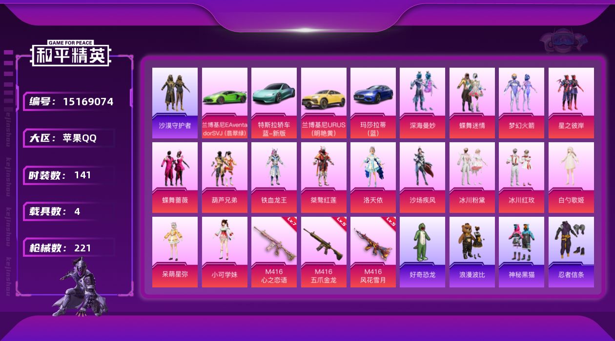 [15169074]【暑期末清货/特价急出/永久包赔】:苹果 手Q-15粉装-3特效枪-4载具-7.6w热力值-7印记-141套装-221枪皮【热门品类】:套装-沙漠守护者,套装-忍者信条【稀有载具】:特斯拉Roadster(水滴蓝),兰博基尼Aventador SVJ(翡翠绿),兰博基尼URUS(明艳黄),玛莎拉蒂Ghibli(蓝)【特效枪等级】:M416-五爪金龙(五级),M416-心之恋语(七级),M416-风花雪月(五级)【优质套装】:粉装-深海曼妙,粉装-蝶舞迷情,粉装-梦幻火箭,粉装-星之彼岸,粉装-蝶舞蔷薇,粉装-葫芦兄弟,粉装-铁血龙王,粉装-桀骜红莲,角色-洛天依,粉装-沙场疾风,粉装-冰川粉黛,粉装-冰川红玫,角色-白勺歌姬,角色-呆萌星弥,角色-小可学妹【优质飞行器】:梦幻火箭飞行器