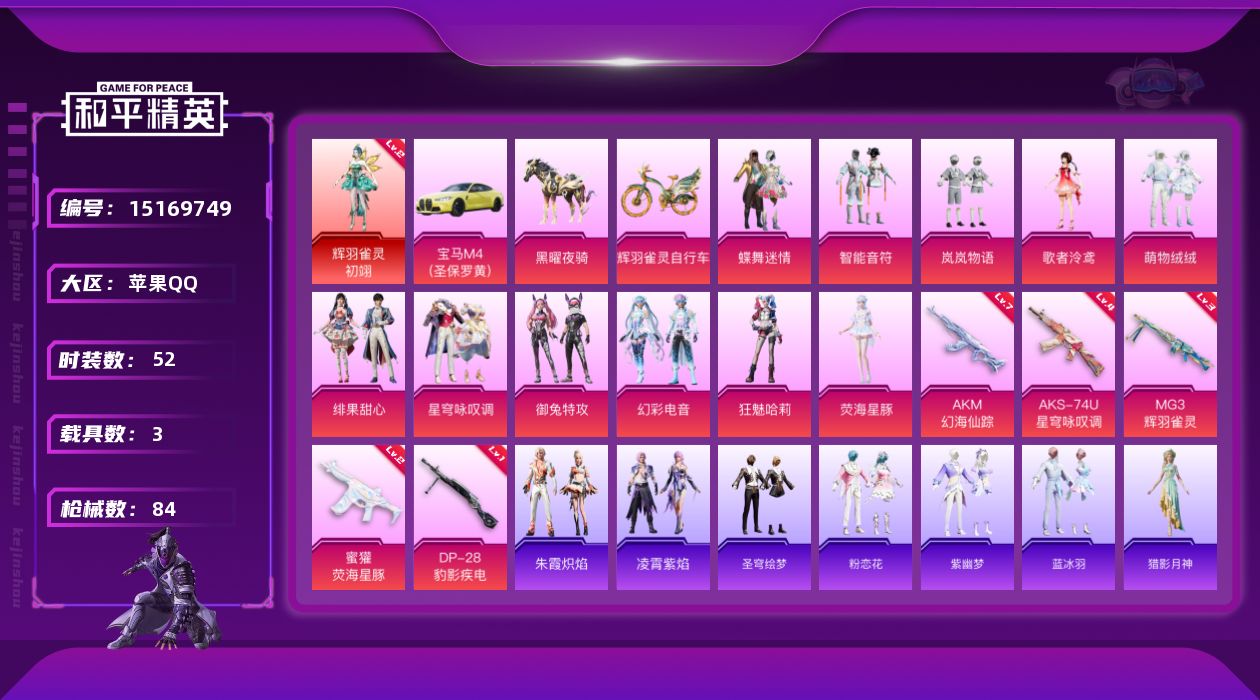 [15169749]【暑期末清货/特价急出/永久包赔】:苹果 手Q-11粉装-5特效枪-3载具-3.4w热力值-3印记-52套装-84枪皮【角色神装等级】:辉羽雀灵-初翊(二级)【稀有载具】:宝马M4(圣保罗黄),黑曜夜骑,辉羽雀灵自行车【特效枪等级】:AKM-幻海仙踪(七级),蜜獾-荧海星豚(二级),AKS-74U-星穹咏叹调(四级),DP-28-豹影疾电(一级),MG3-辉羽雀灵(三级)【优质套装】:粉装-蝶舞迷情,粉装-智能音符,粉装-岚岚物语,角色-歌者泠鸢,粉装-萌物绒绒,粉装-绯果甜心,粉装-星穹咏叹调,粉装-御兔特攻,粉装-幻彩电音,角色-狂魅哈莉,角色-荧海星豚【优质飞行器】:萌物绒绒飞行器,绯果甜心飞行器,幻海仙踪飞行器,雀灵庇佑飞行器,御兔特攻飞行器,时光之吻飞行器,灵猫魔法师飞行器