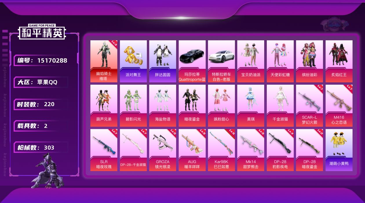 - PX_2020759- 苹果手Q-7王牌印记-有战神框-3粉装-7特效枪-1载具-40623热力值-77套装-121枪皮-2卓越印记-2传奇印记 【3粉装】,星穹咏叹调,玩偶服-猪猪侠,萨利娅 【7特效枪】SCAR-L-锦绣绵绵-5级 GROZA-镜光银凌-5级 AUG-暖羊咩咩-5级 Kar98K-圣域龙灵-2级 Kar98K-巳巳如意-5级 Mk14-甜梦熊击-5级 DP-28-千金淑猫-7级