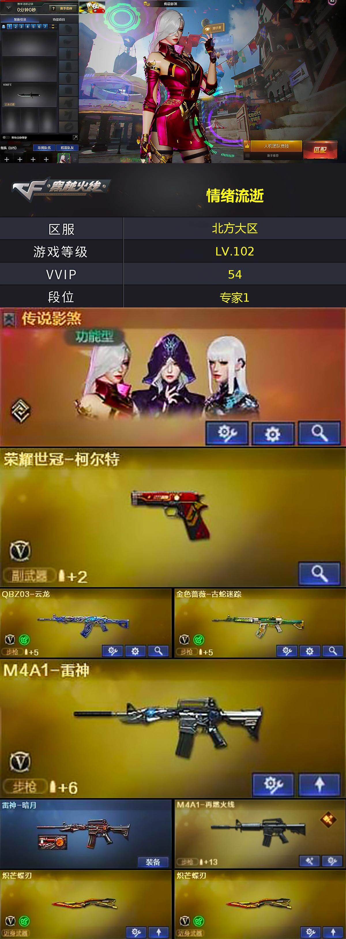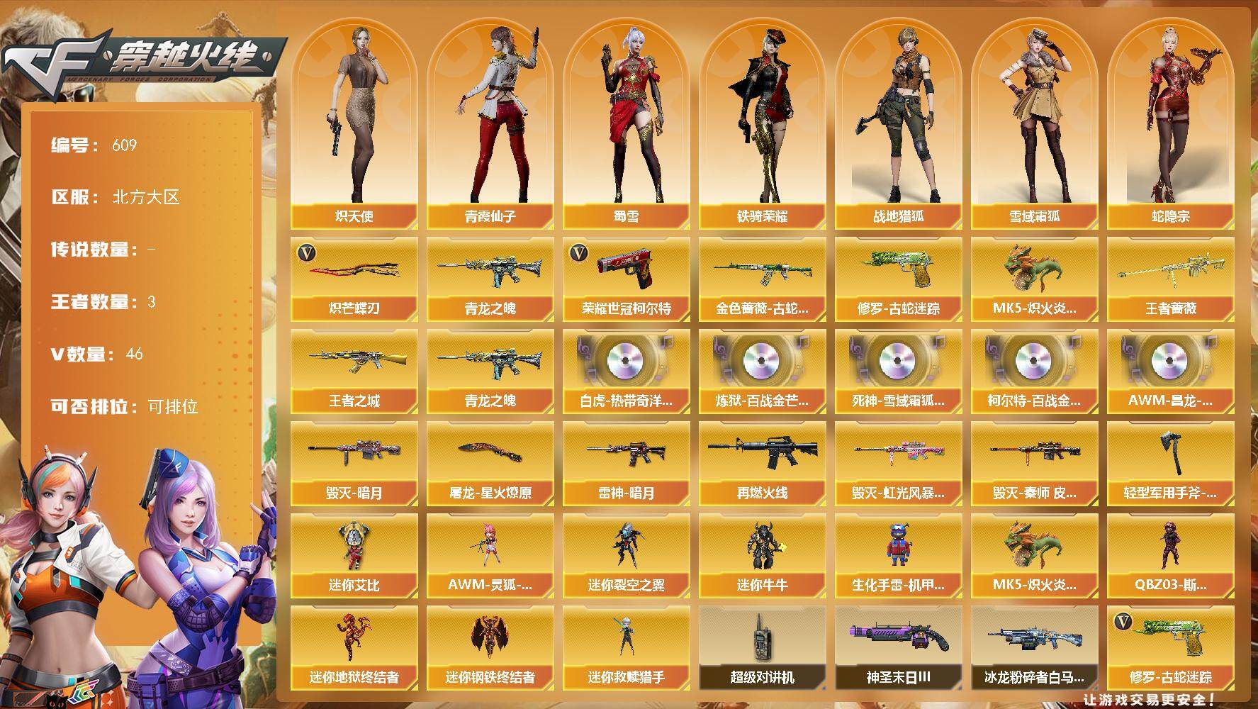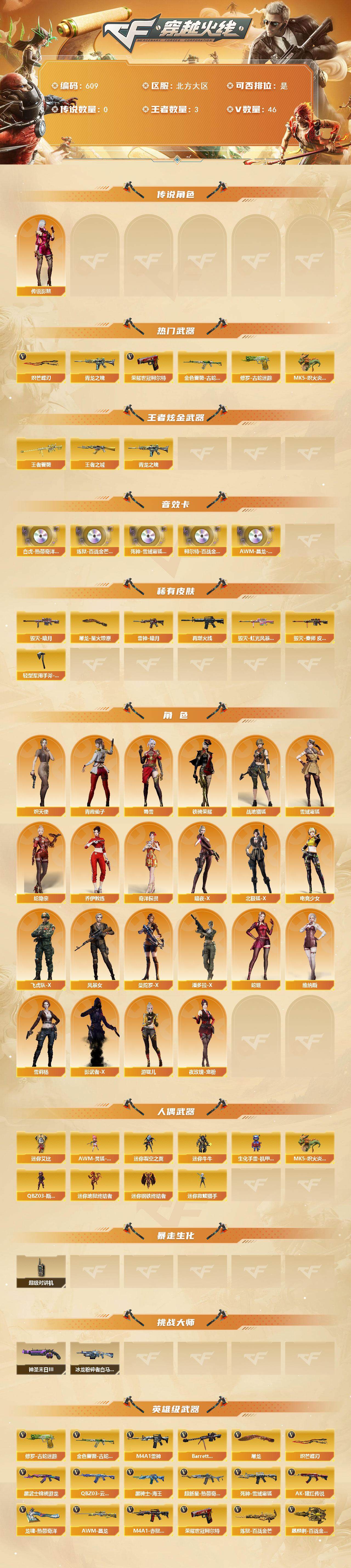 [15174670]北方大区-46V-3王者-0炫金 【传说角色】:传说影煞 【热门武器】:金色蔷薇-古蛇迷踪,修罗-古蛇迷踪,青龙之魄,荣耀世冠-柯尔特,MK5-炽火炎龙,炽芒蝶刃*2 【王者炫金武器】:王者之城,青龙之魄,王者蔷薇 【音效卡】:Scar Light-白虎-热带奇洋音效卡,炼狱-百战金芒-庆典舞曲音效卡,死神-雪域霜狐-怀旧音效卡,柯尔特-百战金芒-庆典舞曲音效卡,AWM-昌龙-怀旧音效卡 【皮肤】:雷神-暗月,M4A1-再燃火线,毁灭-暗月,毁灭-虹光风暴 皮肤,毁灭-秦师 皮肤,屠龙-星火燎原,轻型军用手斧-再燃火线 【角色】:战地猎狐,雪域霜狐,蛇隐宗,奇洋探员,乔伊教练,炽天使,暗夜-X,北极狐-X,电竞少女,飞虎队-X,风暴女,曼陀罗-X,潘多拉-X,青霞仙子,蛇姬,蜀雪,铁骑荣耀,维纳斯,雪莉杨,夜玫瑰-宠粉,影武者-X,游珑儿 【人偶武器】:迷你钢铁终结者,迷你救赎猎手,MK5-炽火炎龙,迷你地狱终结者,AWM-灵狐-15周年嘉年华,迷你裂空之翼,迷你牛牛,生化手雷-机甲核心*4,迷你艾比,QBZ03-斯沃特 【暴走生化】:超级对讲机 【挑战大师】:冰龙粉碎者-白马银枪,神圣爆裂者-末日III 【英雄级武器】:M4A1-雷神,QBZ03-云龙,黑武士-锦绣游龙,超新星-热带奇洋,金色蔷薇-古蛇迷踪,死神-雪域霜狐,AK-47-猩红传说,黑骑士-海王,Barrett-毁灭,炼狱-百战金芒,荣耀世冠-柯尔特,修罗-古蛇迷踪,屠龙,炽芒蝶刃*2,龙啸-热带奇洋,麒麟刺-百战金芒,高爆手雷-云龙*7,手雷-热带奇洋,高爆手雷-古蛇迷踪,闪光弹-云龙*8,烟雾弹-云龙*7,烟雾弹-古蛇迷踪,M4A1-赤狱骑士,M4A1-苍鸣雷神,AWM-昌龙 【道具】:BS战队炫彩背包,CFPL炫彩背包,CFS限定背包,亚洲杯纪念炫彩背包,古蛇迷踪炫彩背包,奇洋探员-海龟背包,沙漠龙背包-猛男专属,炫彩背包-诺拉,炫彩背包,热带奇洋炫彩背包,百战金芒炫彩背包,背包-洛丽塔,虎牙炫彩背包,超级背包,雪域霜狐炫彩背包,女皇终结者-魔龙之吻,救世主-黑桃战神,绿色巨人,灵魂忍者*2,变异宝贝,妖姬,迷雾幽灵*2,生化弹匣*2,夺命之镰,防化服*3,巅峰赛先锋-金色流光,流光-鎏金之域,流光-再燃火线,枪王排位28赛季金色流光,枪王排位29赛季金色流光,语音特效-盛典烟火,语音特效-怀