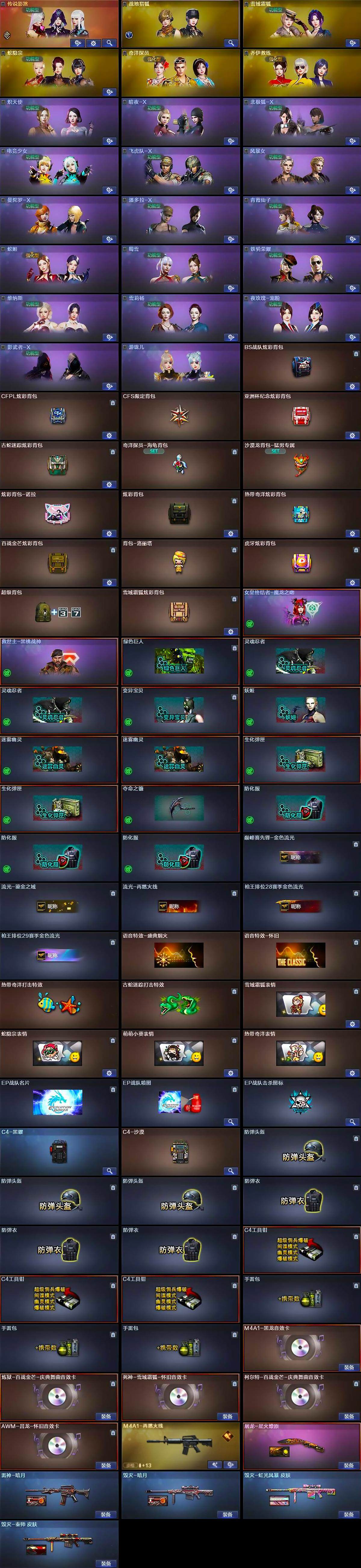 【道具】:BS战队炫彩背包,CFPL炫彩背包,CFS限定背包,亚洲杯纪念炫彩背包,古蛇迷踪炫彩背包,奇洋探员-海龟背包,沙漠龙背包-猛男专属,炫彩背包-诺拉,炫彩背包,热带奇洋炫彩背包,百战金芒炫彩背包,背包-洛丽塔,虎牙炫彩背包,超级背包,雪域霜狐炫彩背包,女皇终结者-魔龙之吻,救世主-黑桃战神,绿色巨人,灵魂忍者*2,变异宝贝,妖姬,迷雾幽灵*2,生化弹匣*2,夺命之镰,防化服*3,巅峰赛先锋-金色流光,流光-鎏金之域,流光-再燃火线,枪王排位28赛季金色流光,枪王排位29赛季金色流光,语音特效-盛典烟火,语音特效-怀