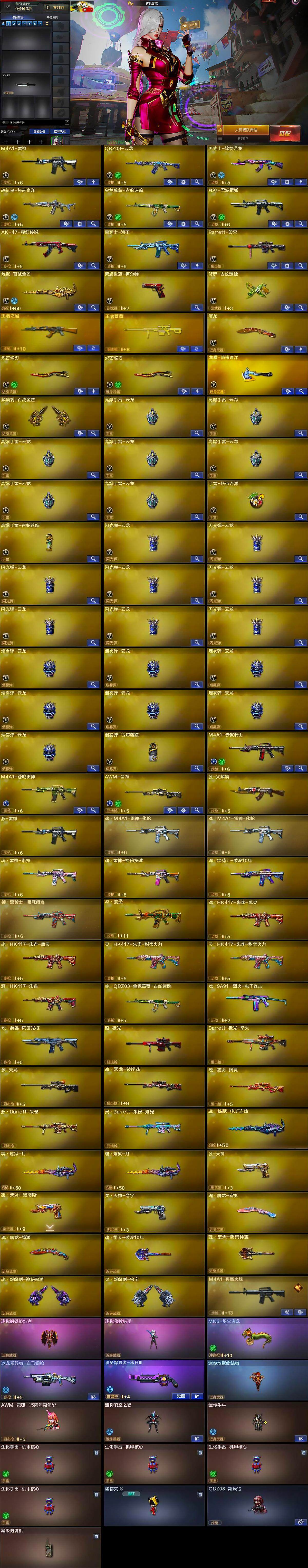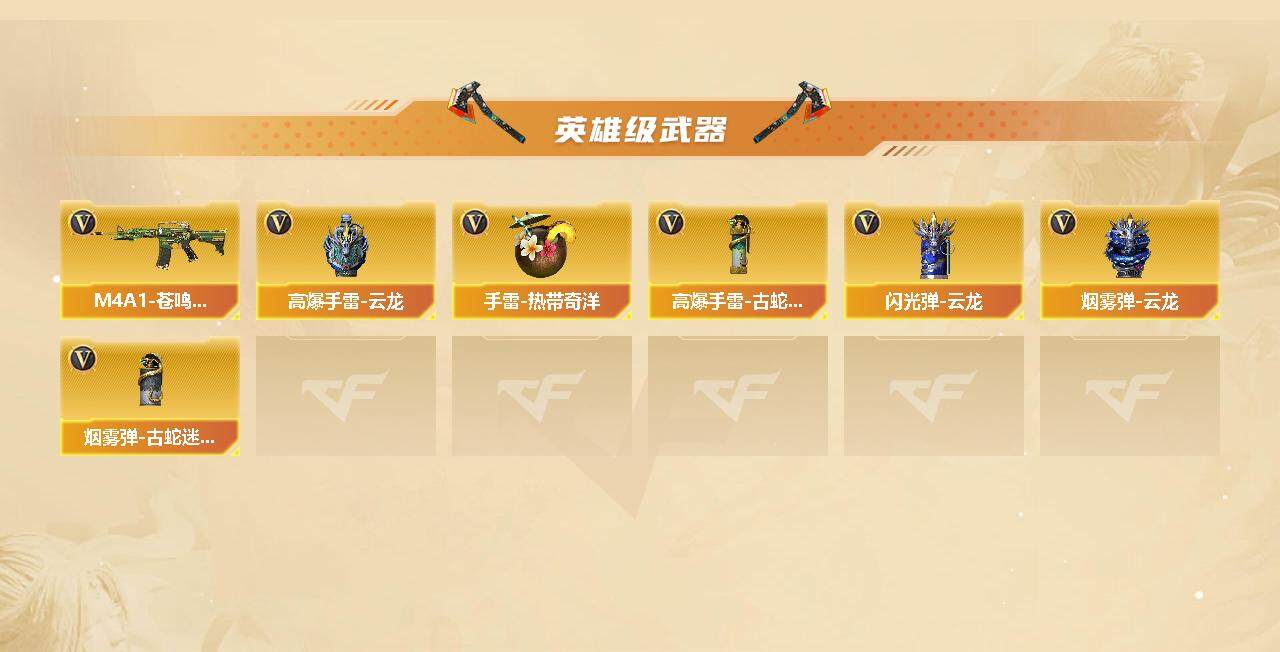 【英雄级武器】:M4A1-雷神,QBZ03-云龙,黑武士-锦绣游龙,超新星-热带奇洋,金色蔷薇-古蛇迷踪,死神-雪域霜狐,AK-47-猩红传说,黑骑士-海王,Barrett-毁灭,炼狱-百战金芒,荣耀世冠-柯尔特,修罗-古蛇迷踪,屠龙,炽芒蝶刃*2,龙啸-热带奇洋,麒麟刺-百战金芒,高爆手雷-云龙*7,手雷-热带奇洋,高爆手雷-古蛇迷踪,闪光弹-云龙*8,烟雾弹-云龙*7,烟雾弹-古蛇迷踪,M4A1-赤狱骑士,M4A1-苍鸣雷神,AWM-昌龙