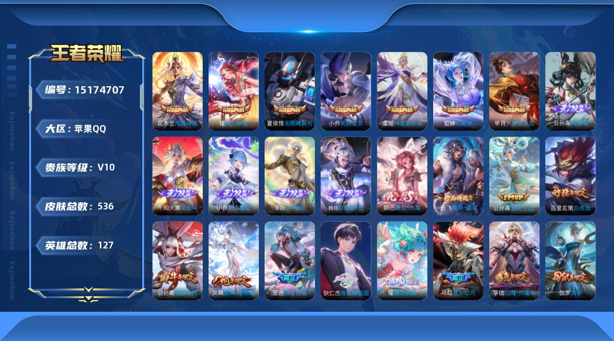 [15174707]【店主推荐捡漏号!可直接换绑】小国标李信苹果Q-V10-最强王者段位-127英雄-536皮肤-7典藏-6无双-1珍品传说-78传说-184史诗