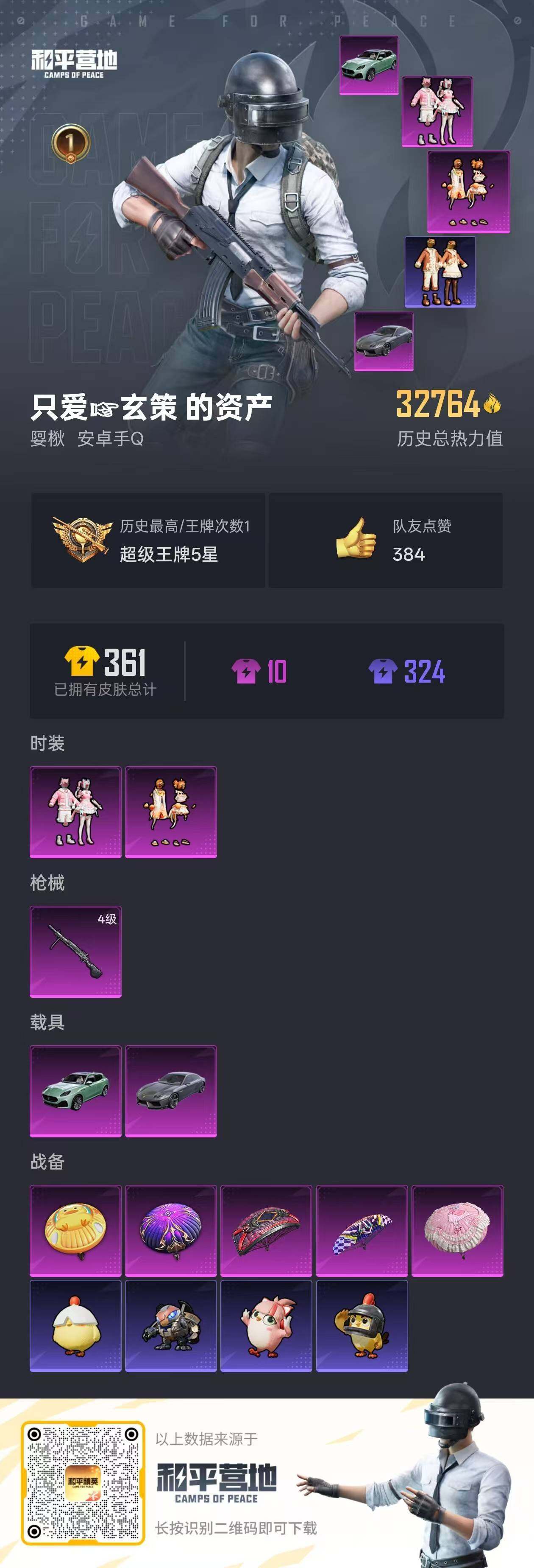 - PX_2091513-8-无二次-安卓Q-64632热力值 13王牌印记1卓越1传奇 历史超级王牌18星 身法号 梦幻火箭 二姐妹 洛天依 蜘蛛侠 天命 满级五爪 蓝螳螂 粉螳螂 鲨鱼裤 4AM战队服 水银刺客 狂沙舞者 164套装 198枪皮 【2载具】 玛莎拉蒂M白色 兰博轿车灰色 【2稀有】 奇异狩猎者 浪漫天命 【8粉装】 梦幻火箭 宝贝奶油派 天使彩虹糖 洛天依 星穹咏叹调 银龙傲海 暗