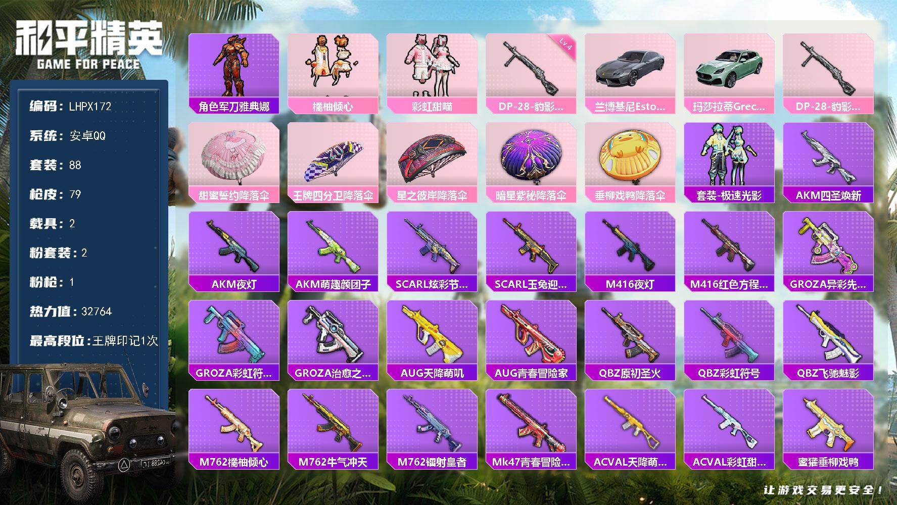 [15174990]【特价出售/店主推荐】 安卓 手Q-2粉装-1特效枪-2载具-0粉色飞行器-3.2w热力值-1王牌印记-88套装-79枪皮【热门品类】:角色-军刀雅典娜【粉色套装】:粉装-橘柚倾心,粉装-彩虹甜喵【粉色枪皮等级】:DP-28-豹影疾电(四级)【粉色载具】:兰博基尼Estoque(银翼灰),玛莎拉蒂Grecale(薄荷绿)【粉色枪皮】:DP-28-豹影疾电