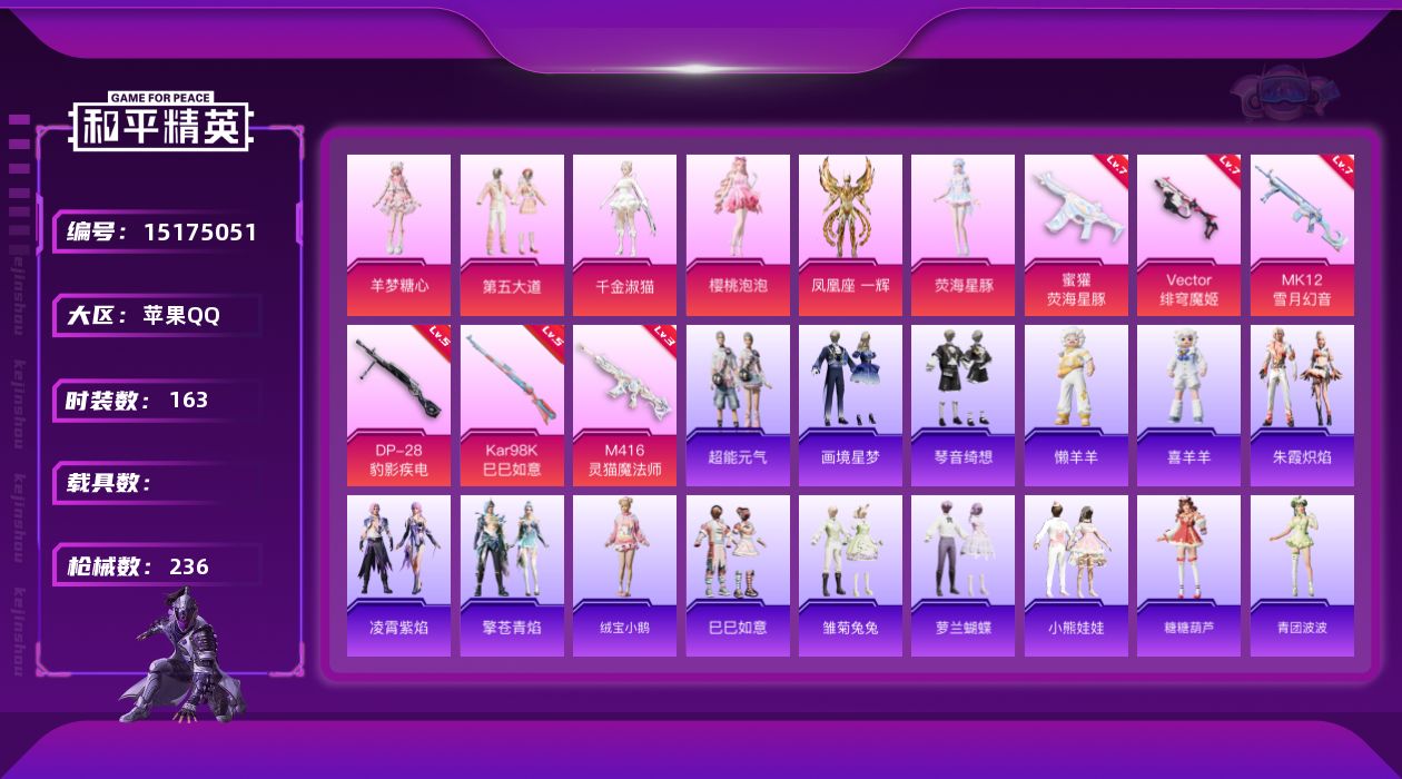 [15175051]【特价出售/店主推荐】苹果 手Q-6粉装-6特效枪-5粉色飞行器-7.4w热力值-13王牌印记-163套装-236枪皮