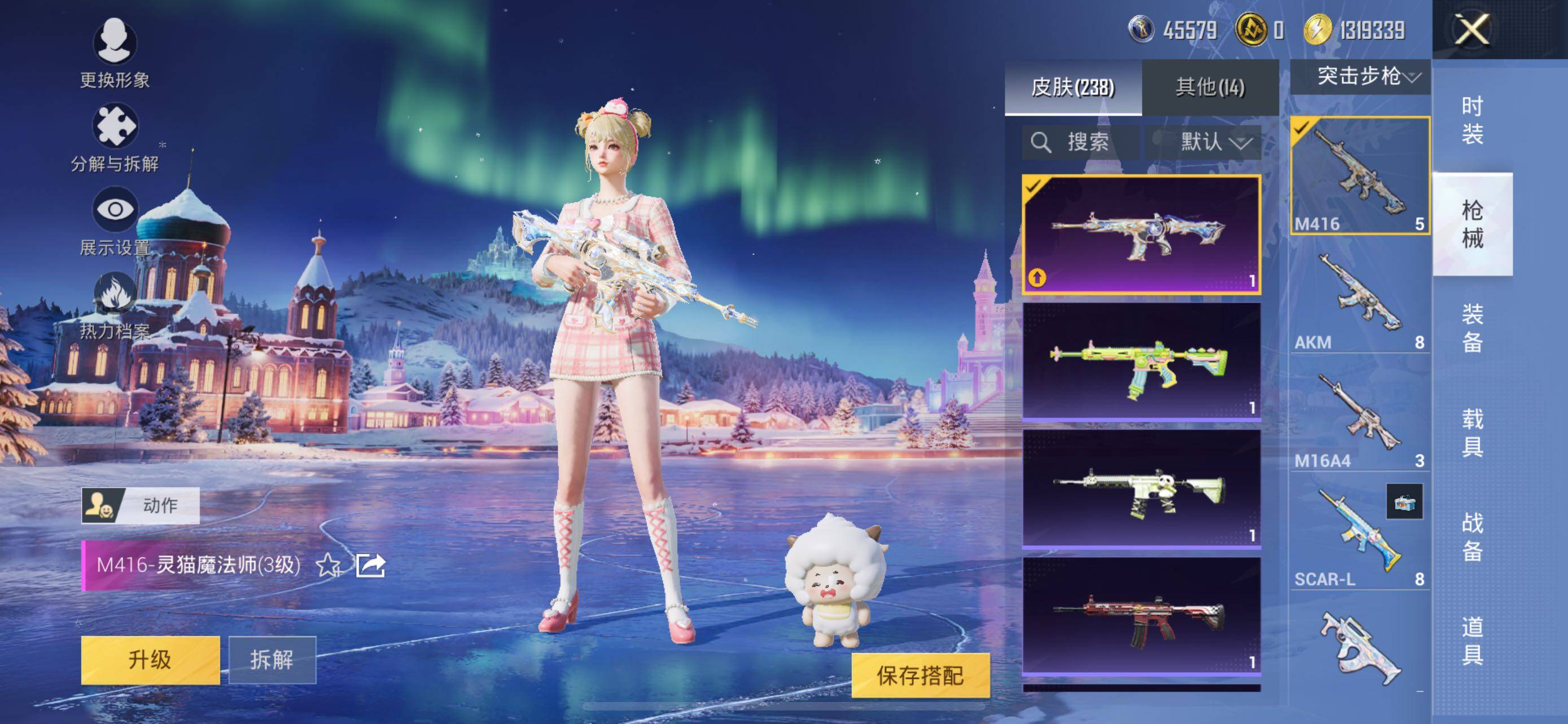 【粉色枪皮等级】:M416-灵猫魔法师(三级),蜜獾-荧海星豚(七级),Vector-绯穹魔姬(七级),Kar98K-巳巳如意(五级),MK12-雪月幻音(七级),DP-28-豹影疾电(五级)