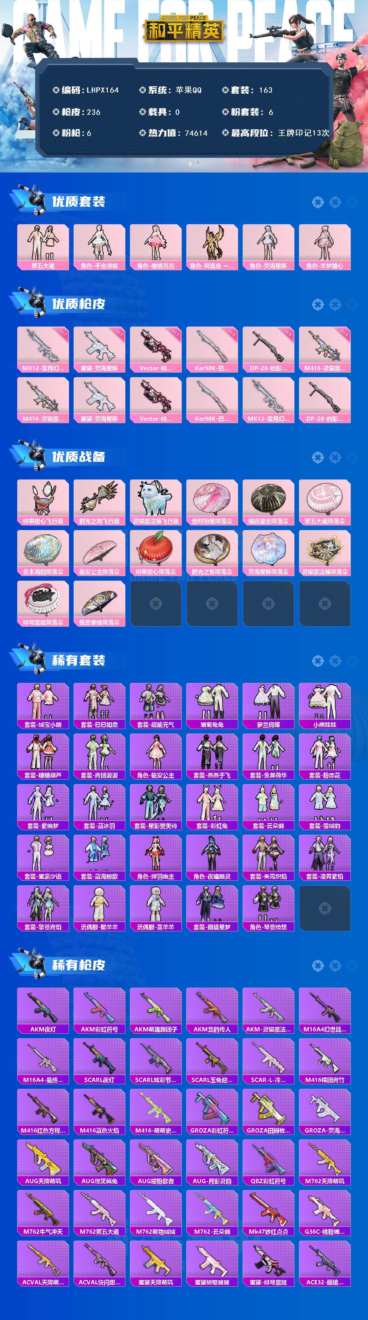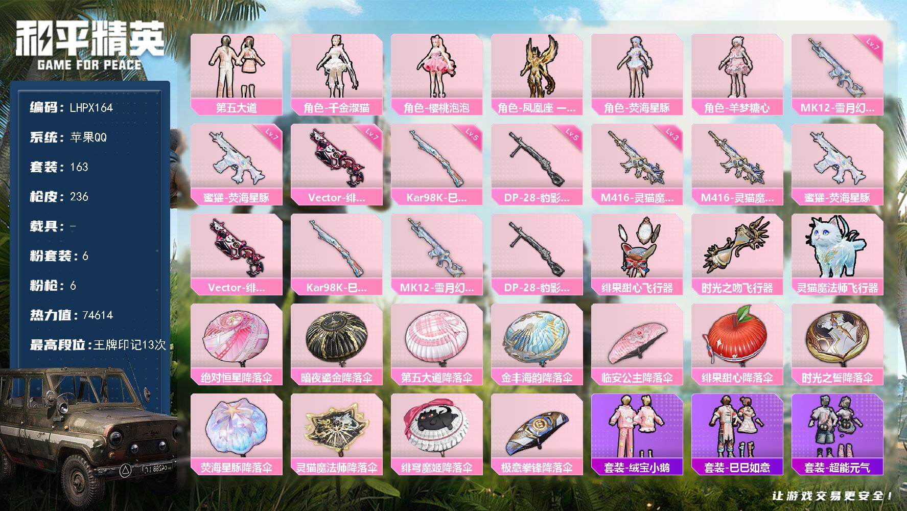 [15175051]【特价出售/店主推荐】苹果 手Q-6粉装-6特效枪-5粉色飞行器-7.4w热力值-13王牌印记-163套装-236枪皮 【粉色套装】:粉装-第五大道,角色-千金淑猫,角色-樱桃泡泡,角色-凤凰座 一辉,角色-荧海星豚,角色-羊梦糖心 【粉色枪皮等级】:M416-灵猫魔法师(三级),蜜獾-荧海星豚(七级),Vector-绯穹魔姬(七级),Kar98K-巳巳如意(五级),MK12-雪月幻音(七级),DP-28-豹影疾电(五级) 【粉色枪皮】:M416-灵猫魔法师,蜜獾-荧海星豚,Vector-绯穹魔姬,Kar98K-巳巳如意,MK12-雪月幻音,DP-28-豹影疾电 【粉色飞行器】:绯果甜心飞行器,时光之吻飞行器,灵猫魔法师飞行器 【粉色降落伞】:绝对恒星降落伞,暗夜鎏金降落伞,第五大道降落伞,金丰海韵降落伞,临安公主降落伞,绯果甜心降落伞,时光之誓降落伞,荧海星豚降落伞,灵猫魔法师降落伞,绯穹魔姬降落伞,极意拳锋降落伞,炫彩糖果降落伞 【稀有套装】:套装-绒宝小鹅,套装-巳巳如意,套装-超能元气,套装-雪国风尚,套装-雏菊兔兔,套装-萝兰蝴蝶,套装-小熊娃娃,套装-糖糖葫芦,套装-青团波波,角色-临安公主,套装-燕燕于飞,套装-鱼渊荷华,套装-粉恋花,套装-紫幽梦,套装-蓝冰羽,套装-星影赞美诗,套装-彩虹兔,套装-云朵鹅,套装-雪绒豹,套装-蜜露汐语,套装-蓝海鲸歌,角色-绛羽幽主,角色-夜瞳黯灵,套装-朱霞炽焰,套装-凌霄紫焰,套装-擎苍青焰,玩偶服-懒羊羊,玩偶服-喜羊羊,套装-画境星梦,套装-琴音绮想,套装-炫彩糖果 【稀有枪皮】:AUG-冰晶雪宝,AKM-夜灯,AKM-彩虹符号,AKM-萌趣颜团子,AKM-龙的传人,AKM-灵猫魔法师,M16A4-幻世战舞者,M16A4-最终圣卫者,SCAR-L-夜灯,SCAR-L-炫彩节奏,SCAR-L-玉兔迎春,SCAR-L-冷漠罗丽,M416-糯团青竹,M416-红色方程式,M416-蓝色火焰,M416-萌萌史莱姆,GROZA-彩虹符号,GROZA-田园牧歌,GROZA-荧海星豚,AUG-天降萌叽,AUG-怪笑疯兔,AUG-耀粉歌者,AUG-月影灵韵,QBZ-彩虹符号,M762-天降萌叽,M762-牛气冲天,M762-第五大道,M762-萌物绒绒,M762-云朵鹅,Mk47-妙红点点,G36C-桃粉嫣然,AC-VAL