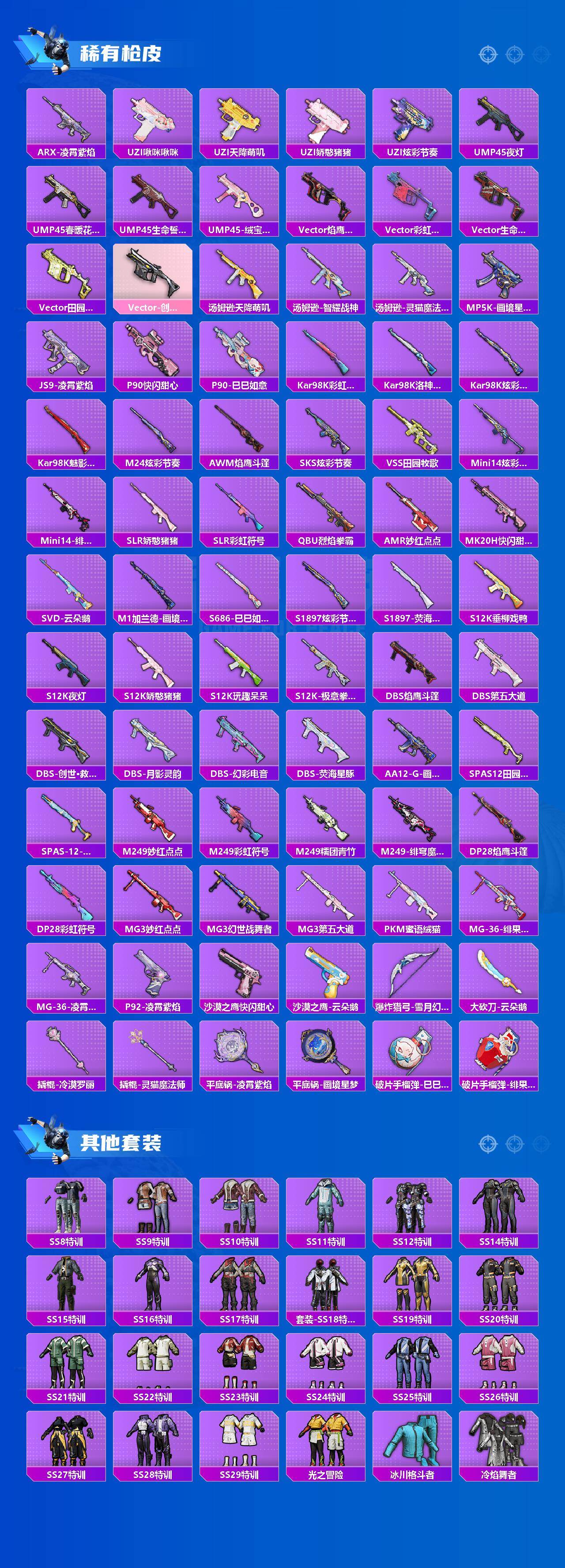 【稀有枪皮】:AUG-冰晶雪宝,AKM-夜灯,AKM-彩虹符号,AKM-萌趣颜团子,AKM-龙的传人,AKM-灵猫魔法师,M16A4-幻世战舞者,M16A4-最终圣卫者,SCAR-L-夜灯,SCAR-L-炫彩节奏,SCAR-L-玉兔迎春,SCAR-L-冷漠罗丽,M416-糯团青竹,M416-红色方程式,M416-蓝色火焰,M416-萌萌史莱姆,GROZA-彩虹符号,GROZA-田园牧歌,GROZA-荧海星豚,AUG-天降萌叽,AUG-怪笑疯兔,AUG-耀粉歌者,AUG-月影灵韵,QBZ-彩虹符号,M762-天降萌叽,M762-牛气冲天,M762-第五大道,M762-萌物绒绒,M762-云朵鹅,Mk47-妙红点点,G36C-桃粉嫣然,AC-VAL