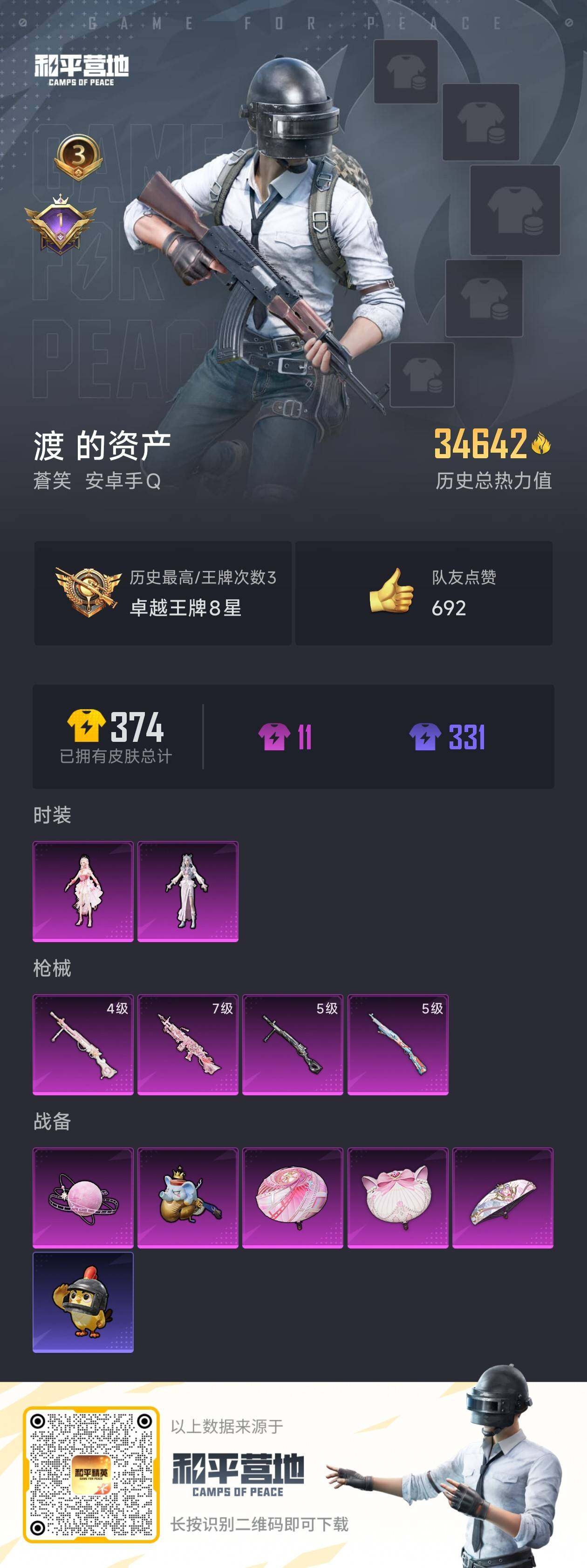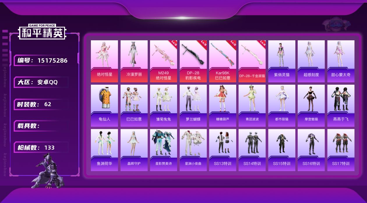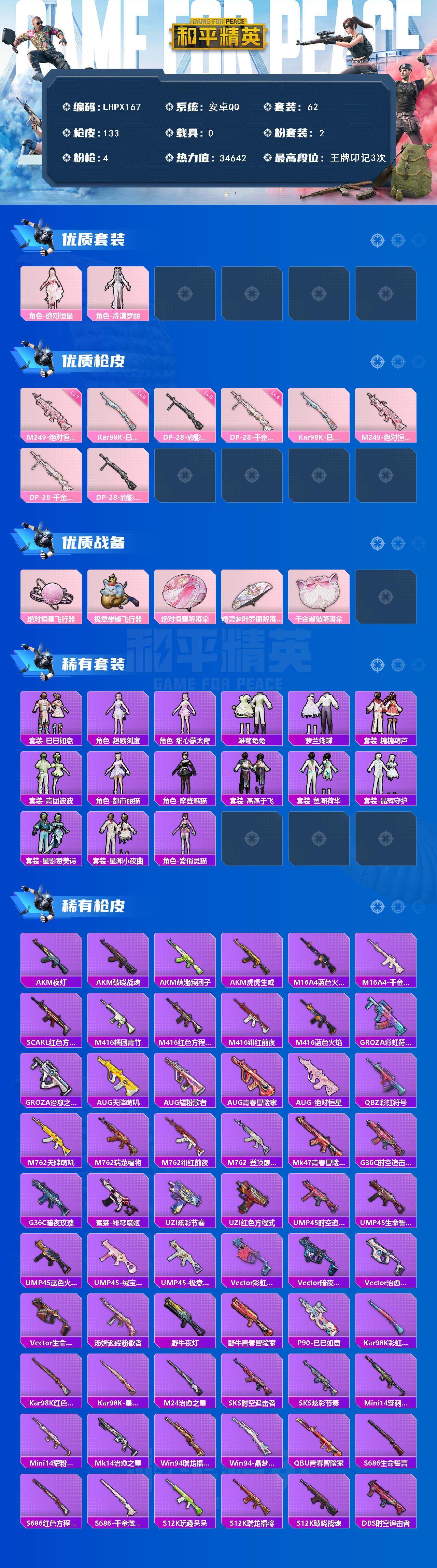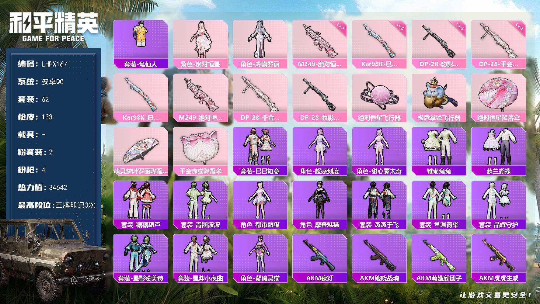 [15175286]【特价出售/店主推荐】安卓 手Q-2粉装-4特效枪-2粉色飞行器-3.4w热力值-3王牌印记-62套装-133枪皮 【热门品类】:套装-龟仙人 【粉色套装】:角色-绝对恒星,角色-冷漠罗丽 【粉色枪皮等级】:Kar98K-巳巳如意(五级),M249-绝对恒星(七级),DP-28-千金淑猫(四级),DP-28-豹影疾电(五级) 【粉色枪皮】:Kar98K-巳巳如意,M249-绝对恒星,DP-28-千金淑猫,DP-28-豹影疾电 【粉色飞行器】:绝对恒星飞行器,极意拳锋飞行器 【粉色降落伞】:绝对恒星降落伞,精灵梦叶罗丽降落伞,千金淑猫降落伞 【稀有套装】:套装-龟仙人,套装-巳巳如意,角色-超感刻度,角色-甜心蒙太奇,套装-雪国风尚,套装-雏菊兔兔,套装-萝兰蝴蝶,套装-糖糖葫芦,套装-青团波波,角色-都市丽猫,角色-摩登魅猫,套装-燕燕于飞,套装-鱼渊荷华,套装-晶辉守护,套装-星影赞美诗,套装-星渊小夜曲,角色-紫俏灵猫 【稀有枪皮】:AKM-夜灯,AKM-破晓战魂,AKM-萌趣颜团子,AKM-虎虎生威,M16A4-蓝色火焰,M16A4-千金淑猫,SCAR-L-红色方程式,M416-糯团青竹,M416-红色方程式,M416-绯红前夜,M416-蓝色火焰,GROZA-彩虹符号,GROZA-治愈之星,AUG-天降萌叽,AUG-耀粉歌者,AUG-青春冒险家,AUG-绝对恒星,QBZ-彩虹符号,M762-天降萌叽,M762-瑞龙福将,M762-绯红前夜,M762-登顶巅峰,Mk47-青春冒险家,G36C-时空追击者,G36C-暗夜玫瑰,蜜獾-绯穹魔姬,UZI-炫彩节奏,UZI-红色方程式,UMP45-时空追击者,UMP45-生命誓言,UMP45-蓝色火焰,UMP45-绒宝小鹅,UMP45-极意拳锋,Vector-彩虹符号,Vector-暗夜玫瑰,Vector-治愈之星,Vector-生命誓言,汤姆逊-耀粉歌者,野牛-夜灯,野牛-青春冒险家,P90-巳巳如意,Kar98K-彩虹符号,Kar98K-红色方程式,Kar98K-星穹咏叹调,M24-治愈之星,SKS-时空追击者,SKS-炫彩节奏,Mini14-穿刺龙虾,Mini14-耀粉歌者,Mk14-治愈之星,Win94-瑞龙福将,Win94-晶梦幻蝶,QBU-青春冒险家,S686-生命誓言,S686-红色方程式,S686-千