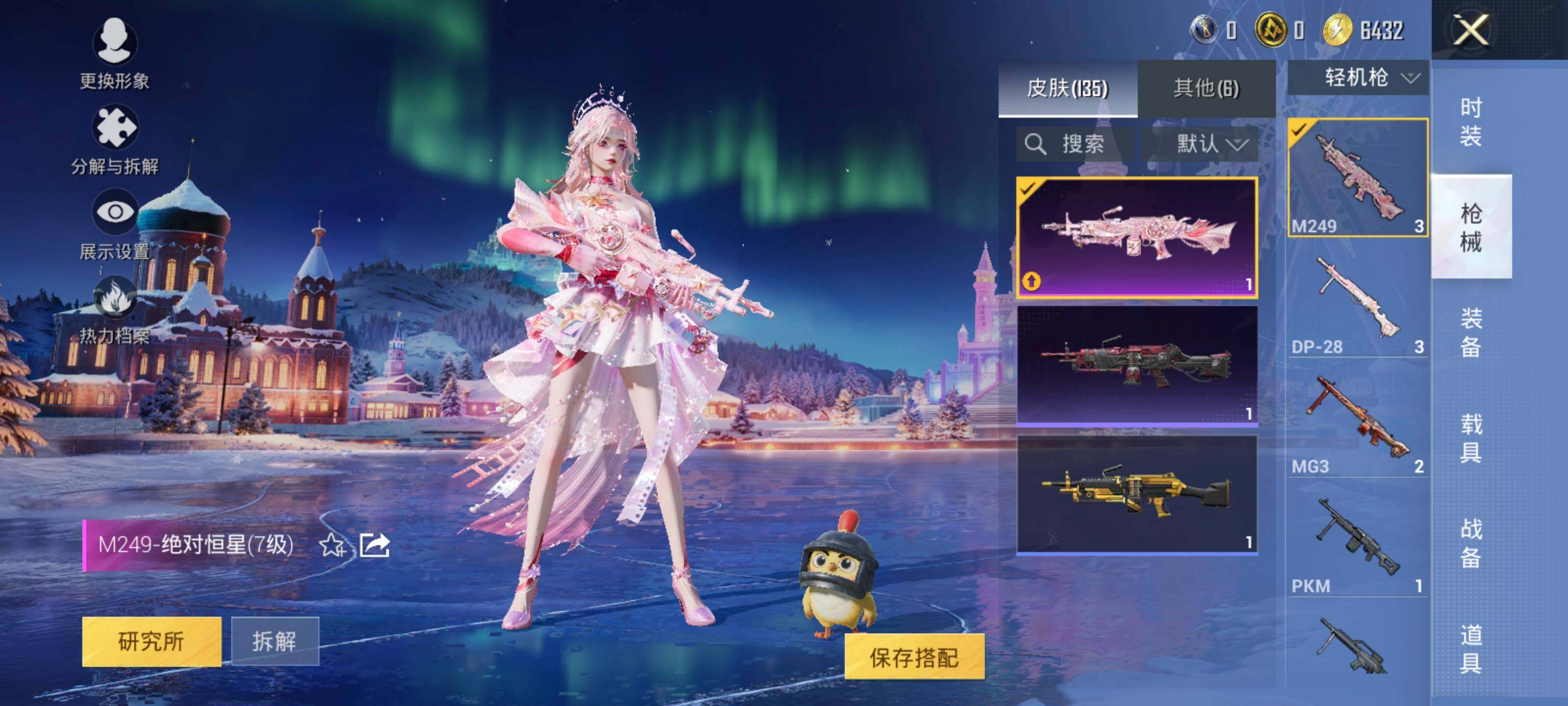 【粉色枪皮等级】:Kar98K-巳巳如意(五级),M249-绝对恒星(七级),DP-28-千金淑猫(四级),DP-28-豹影疾电(五级)