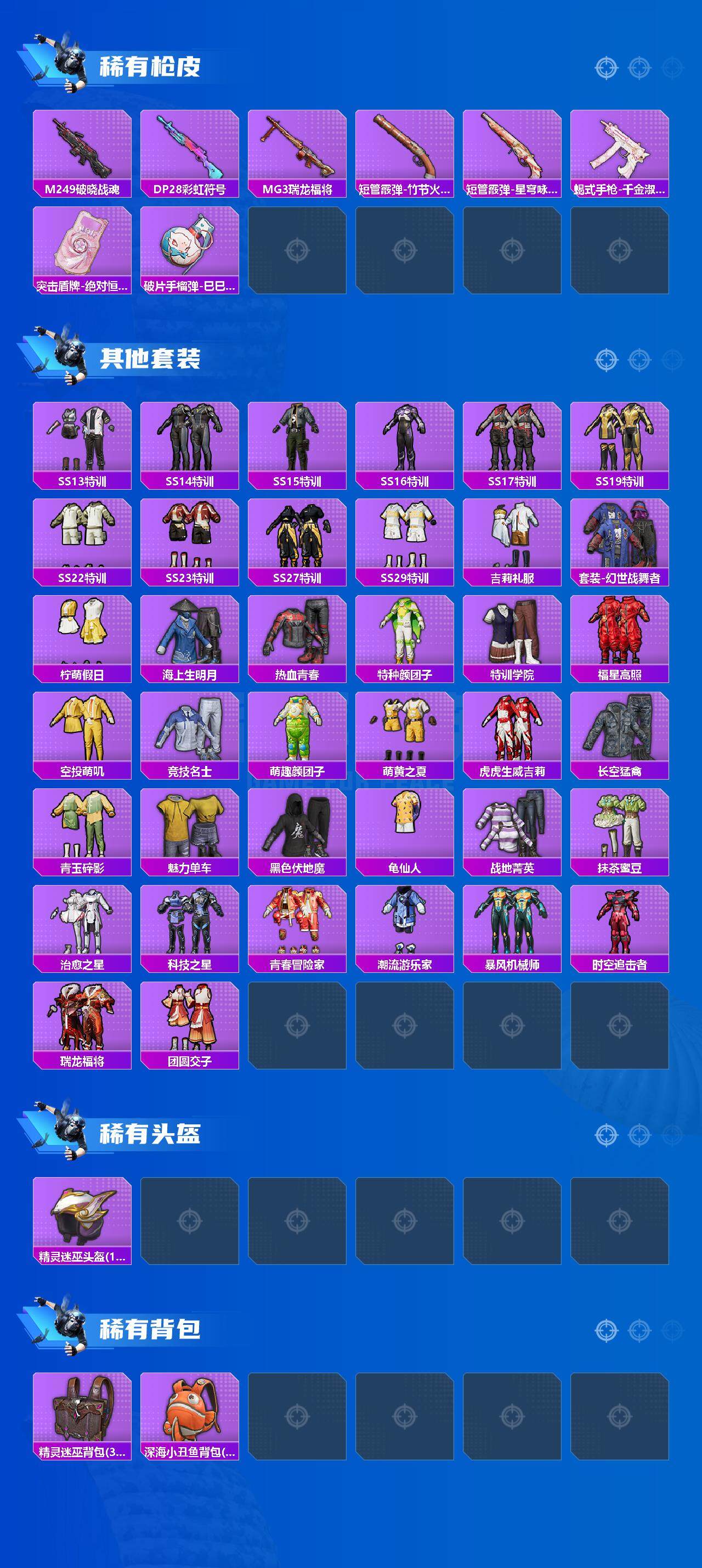 【稀有枪皮】:AKM-夜灯,AKM-破晓战魂,AKM-萌趣颜团子,AKM-虎虎生威,M16A4-蓝色火焰,M16A4-千金淑猫,SCAR-L-红色方程式,M416-糯团青竹,M416-红色方程式,M416-绯红前夜,M416-蓝色火焰,GROZA-彩虹符号,GROZA-治愈之星,AUG-天降萌叽,AUG-耀粉歌者,AUG-青春冒险家,AUG-绝对恒星,QBZ-彩虹符号,M762-天降萌叽,M762-瑞龙福将,M762-绯红前夜,M762-登顶巅峰,Mk47-青春冒险家,G36C-时空追击者,G36C-暗夜玫瑰,蜜獾-绯穹魔姬,UZI-炫彩节奏,UZI-红色方程式,UMP45-时空追击者,UMP45-生命誓言,UMP45-蓝色火焰,UMP45-绒宝小鹅,UMP45-极意拳锋,Vector-彩虹符号,Vector-暗夜玫瑰,Vector-治愈之星,Vector-生命誓言,汤姆逊-耀粉歌者,野牛-夜灯,野牛-青春冒险家,P90-巳巳如意,Kar98K-彩虹符号,Kar98K-红色方程式,Kar98K-星穹咏叹调,M24-治愈之星,SKS-时空追击者,SKS-炫彩节奏,Mini14-穿刺龙虾,Mini14-耀粉歌者,Mk14-治愈之星,Win94-瑞龙福将,Win94-晶梦幻蝶,QBU-青春冒险家,S686-生命誓言,S686-红色方程式,S686-千